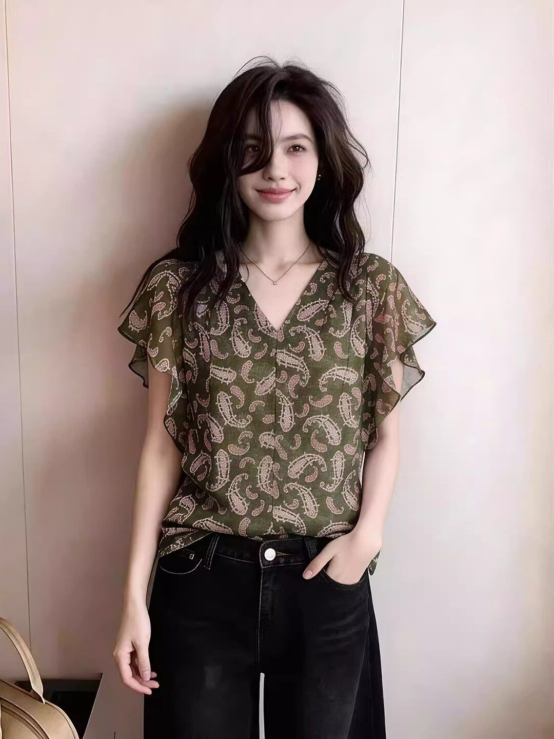 여름 새로운 고급 보헤미안 바람 V넥 프린트 맨위 여성 녹색 한 마디 소매 슬림해 보이는 캐주얼 빅 사이즈 인사이드 가져 가라.