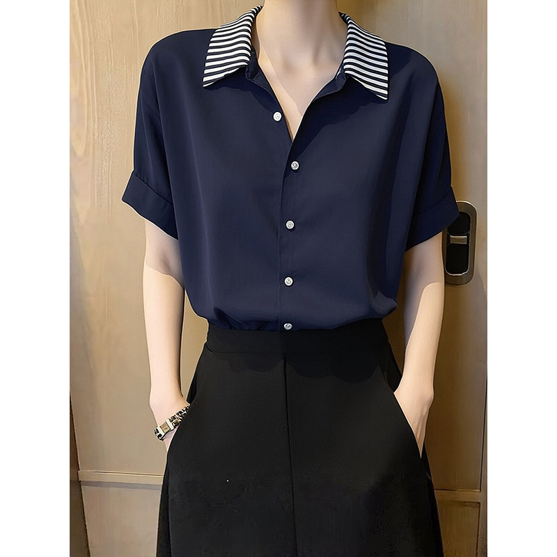 튀김 거리 프랑스식 품격 블루 색상 POLO 칼라 반팔 여성 셔츠 스트라이프 패치워크 루즈핏 슬림해 보이는 맨위 클래식 섹션