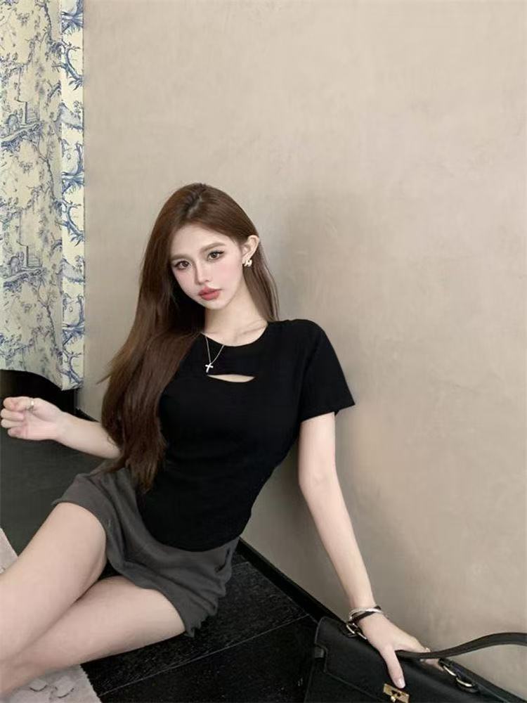 한국 스타일 핫걸 순면 반팔 티셔츠 여성 여름 새로운 디자인 센스 반 개방 칼라 단추 순수한 욕망 몸매 가꾸기 섹시함 맨위