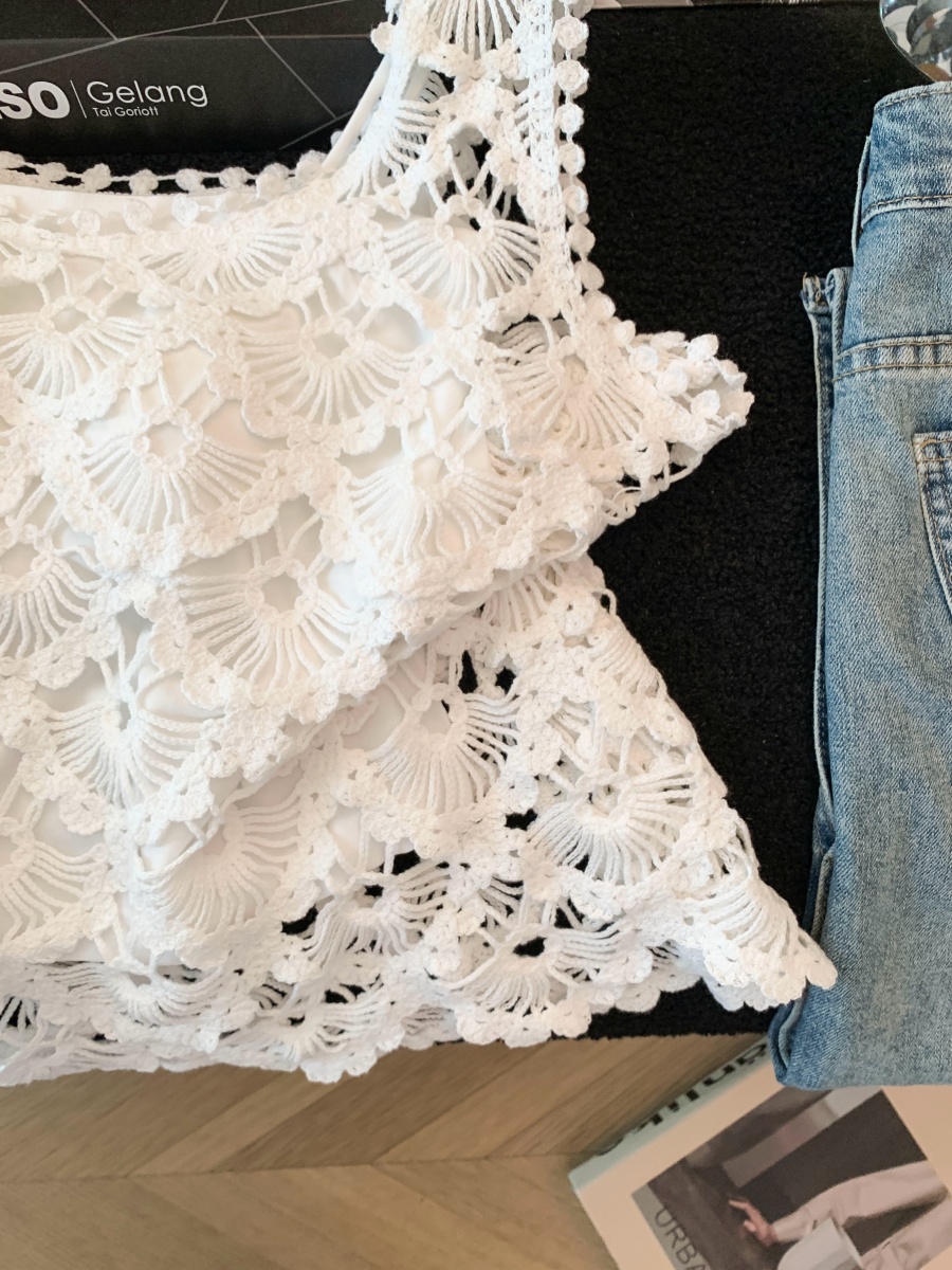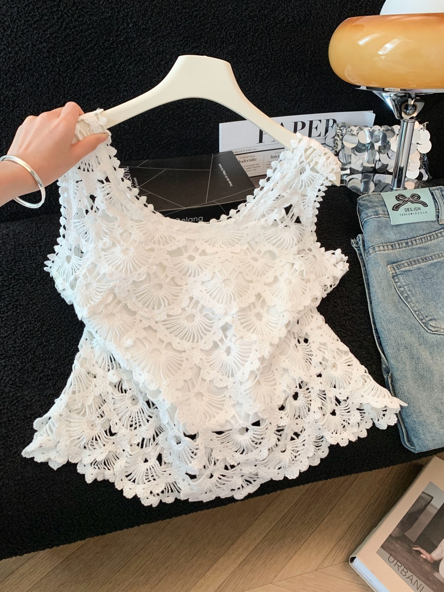 실사 프랑스식 레트로 자수 홀로우 아웃 니트 베스트 조끼 여성 여름 새로운 외국 가스 민소매 어깨 맨위