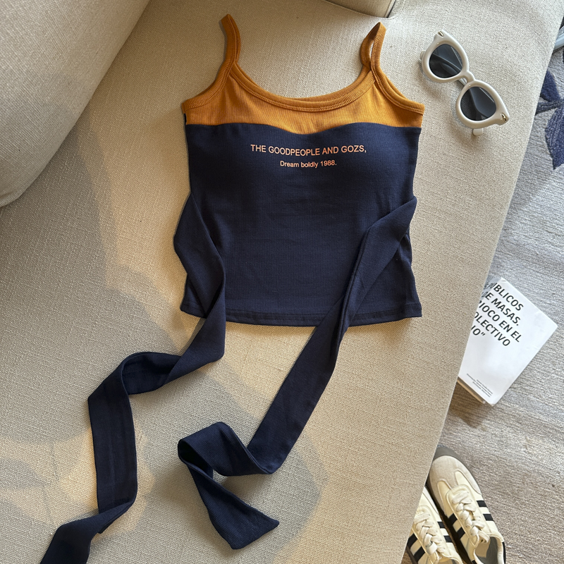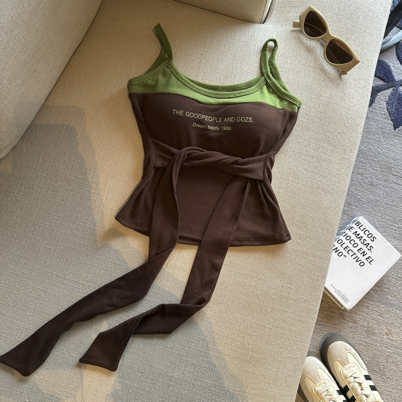 실사 페이크 레이어드 배색 니트 조끼 슬립 여성 벨트 가슴 패드 여름 외출용 몸매 가꾸기 쇼트 스타일 스트랩 맨위
