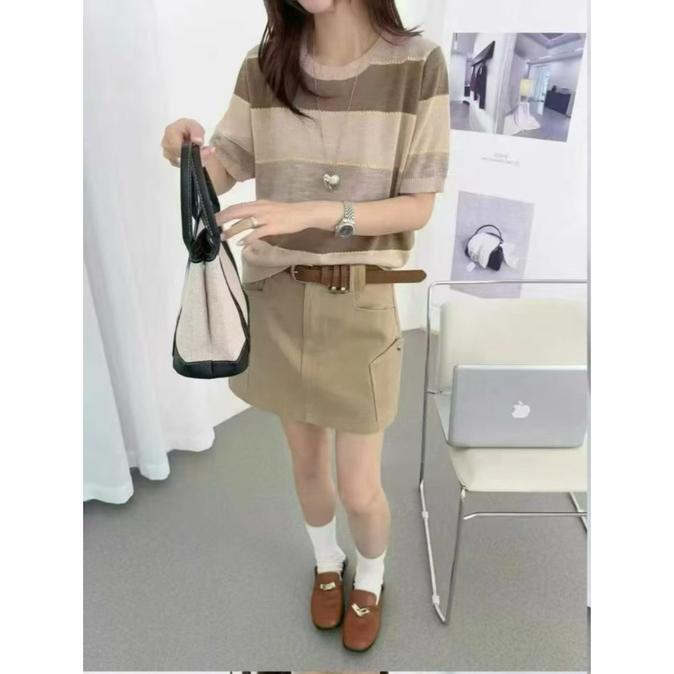 2026 년 여름 다용도 외국 가스 패션 한국 스타일 신선함 부드러운 라운드 넥 스트라이프 패치워크 레이스업 니트 반팔