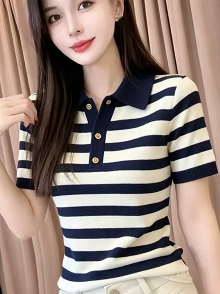 올해 인기 ~ 중 폭발 여성 의류 여름 2026 새로운 스트라이프 POLO 칼라 얼음 실크 반팔 니트 티셔츠 맨위