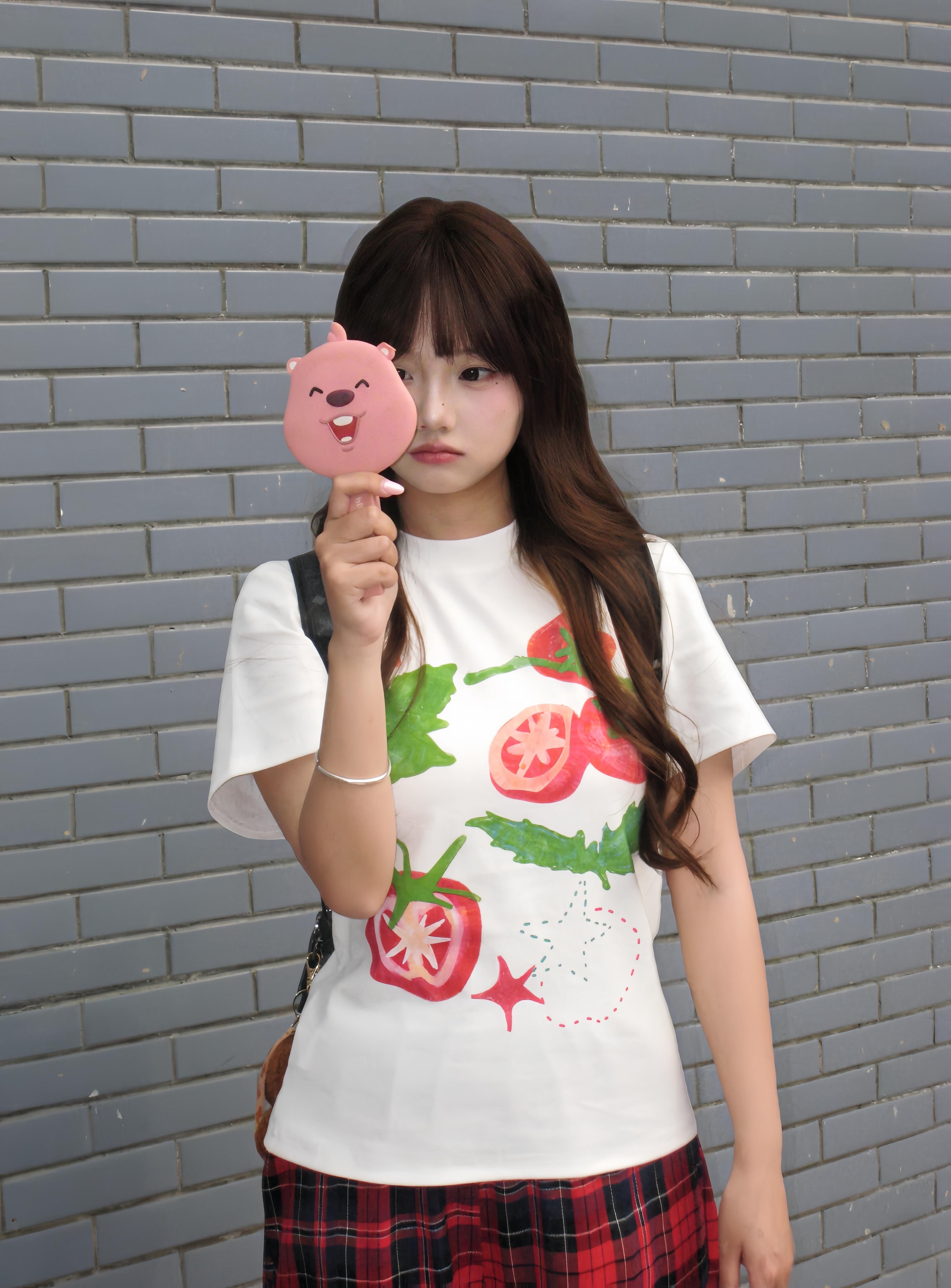 토마토 과일 재미있는 낙서 반팔 티셔츠 여성 2026 여름 한 부서 디자인 긍정적 인 어깨 루즈핏 맨위
