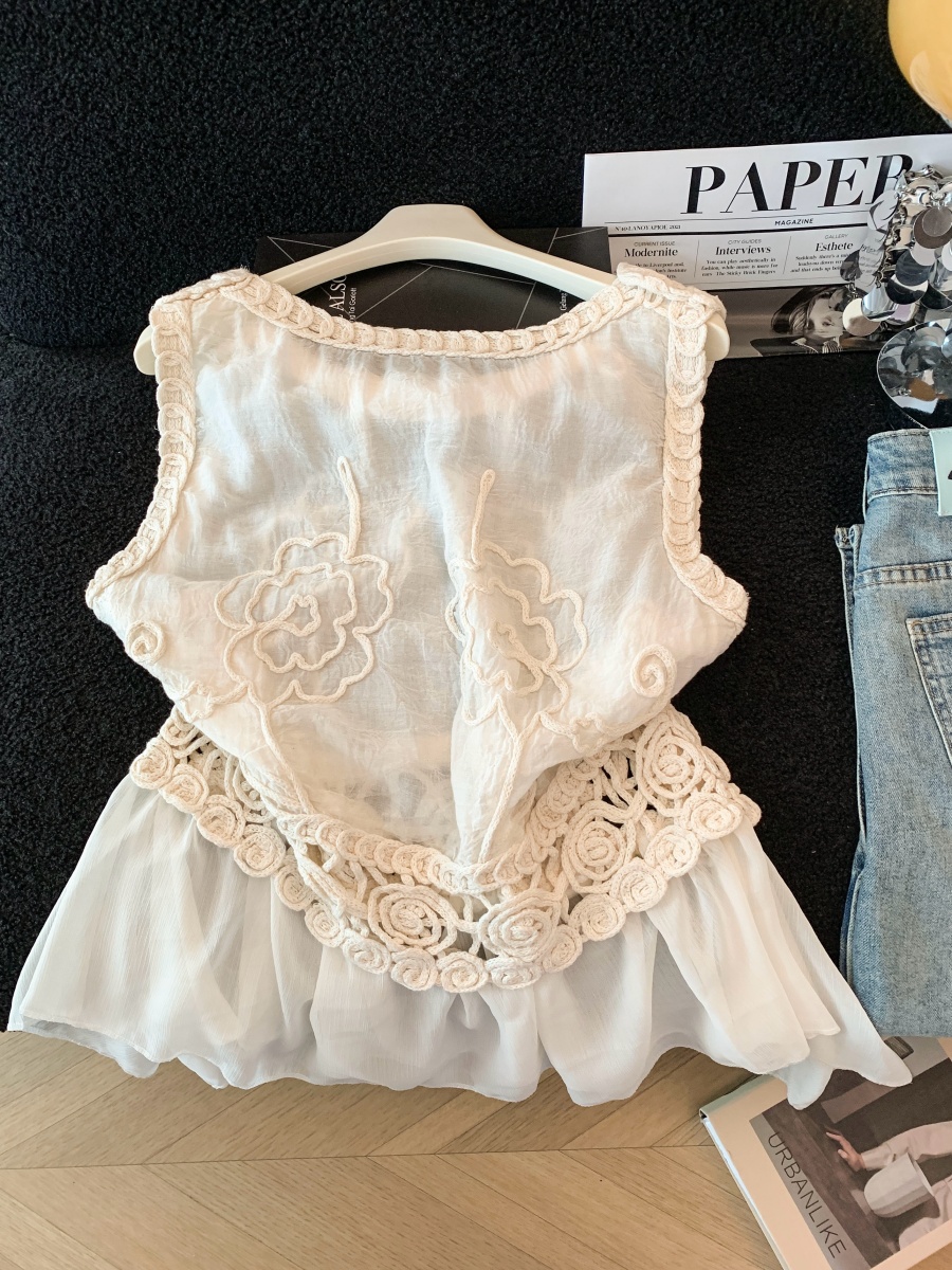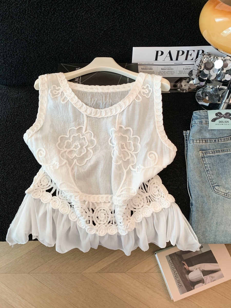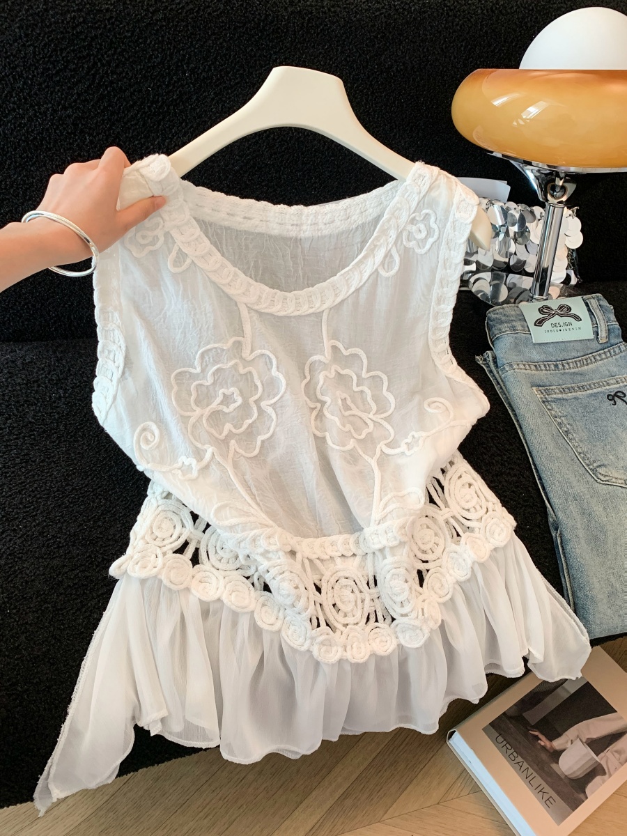 실사 무거운 작업 홀로우 아웃 자수 패치워크 쉬폰 민소매 맨위 여성 외부 가져 가라. 스택 착용 센 부서 레트로 스택 착용 블라우스 여름