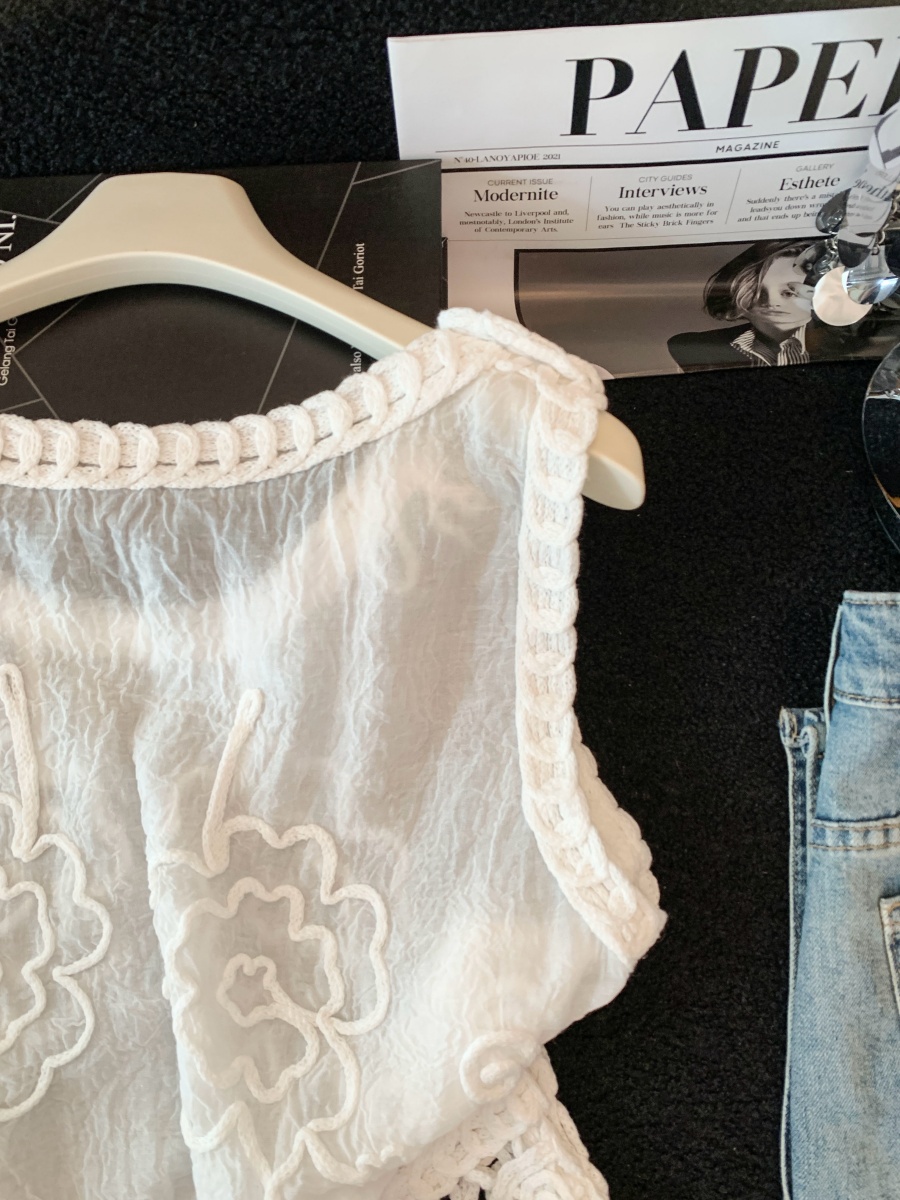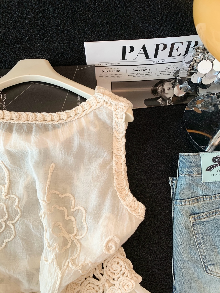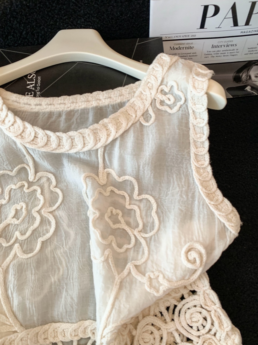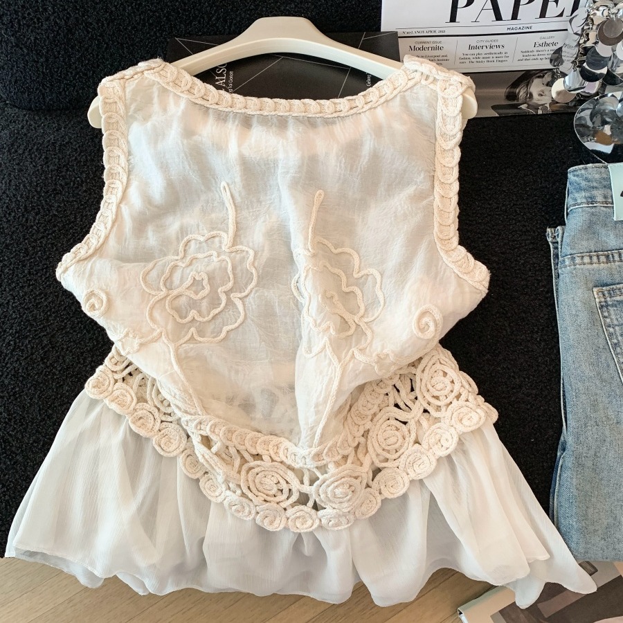 실사 무거운 작업 홀로우 아웃 자수 패치워크 쉬폰 민소매 맨위 여성 외부 가져 가라. 스택 착용 센 부서 레트로 스택 착용 블라우스 여름