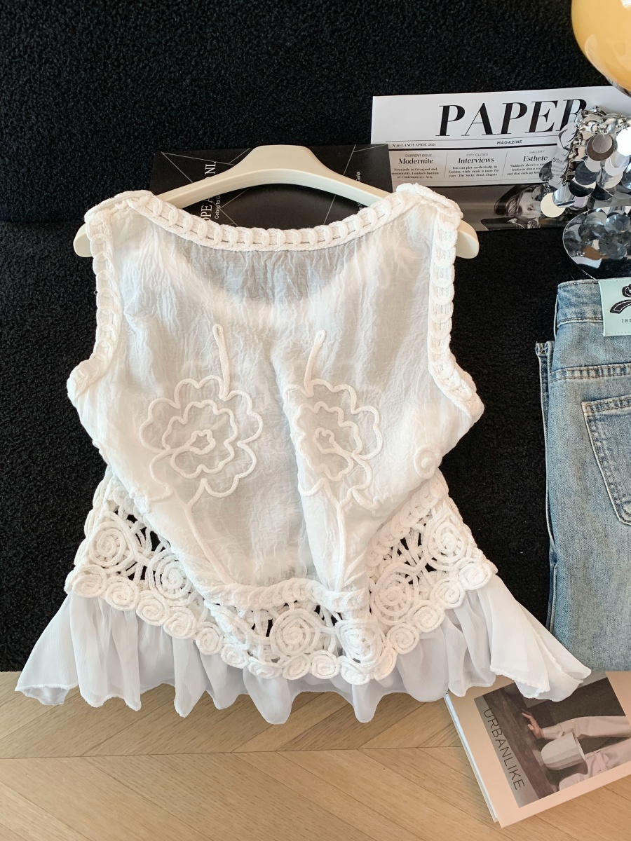 실사 프랑스식 홀로우 아웃 자수 술 V넥 니트 베스트 조끼 여성 여름 외국 가스 스택 착용 맨위