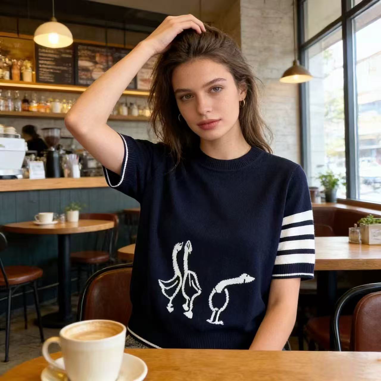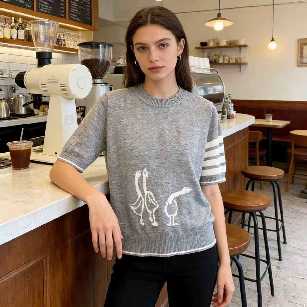 thom 여름 새로운 학원 스타일 기러기 내장 꽃 네 도로 바 반팔 니트 티셔츠 여성 레저 라운드 넥 맨위