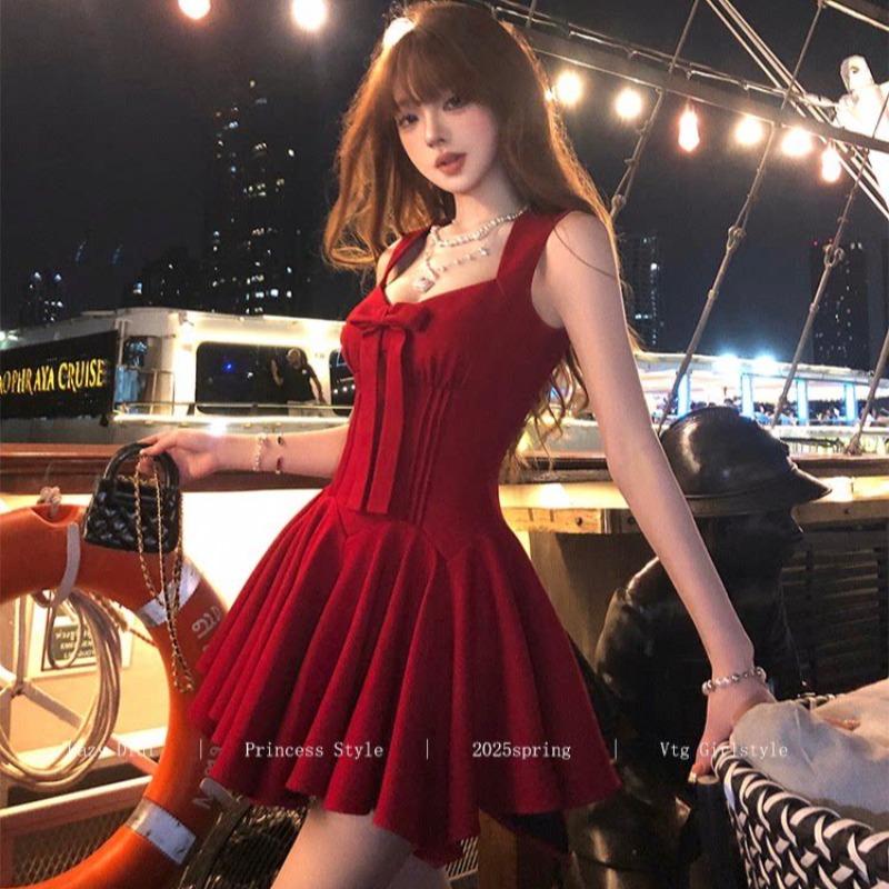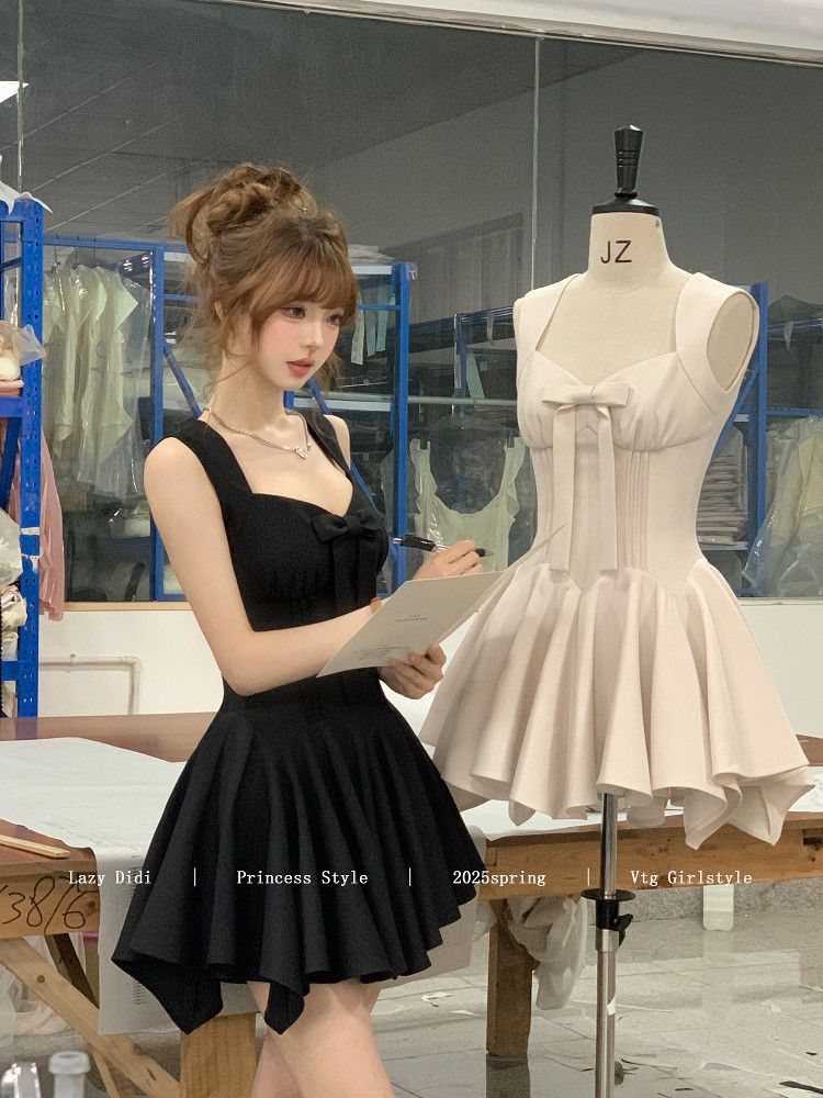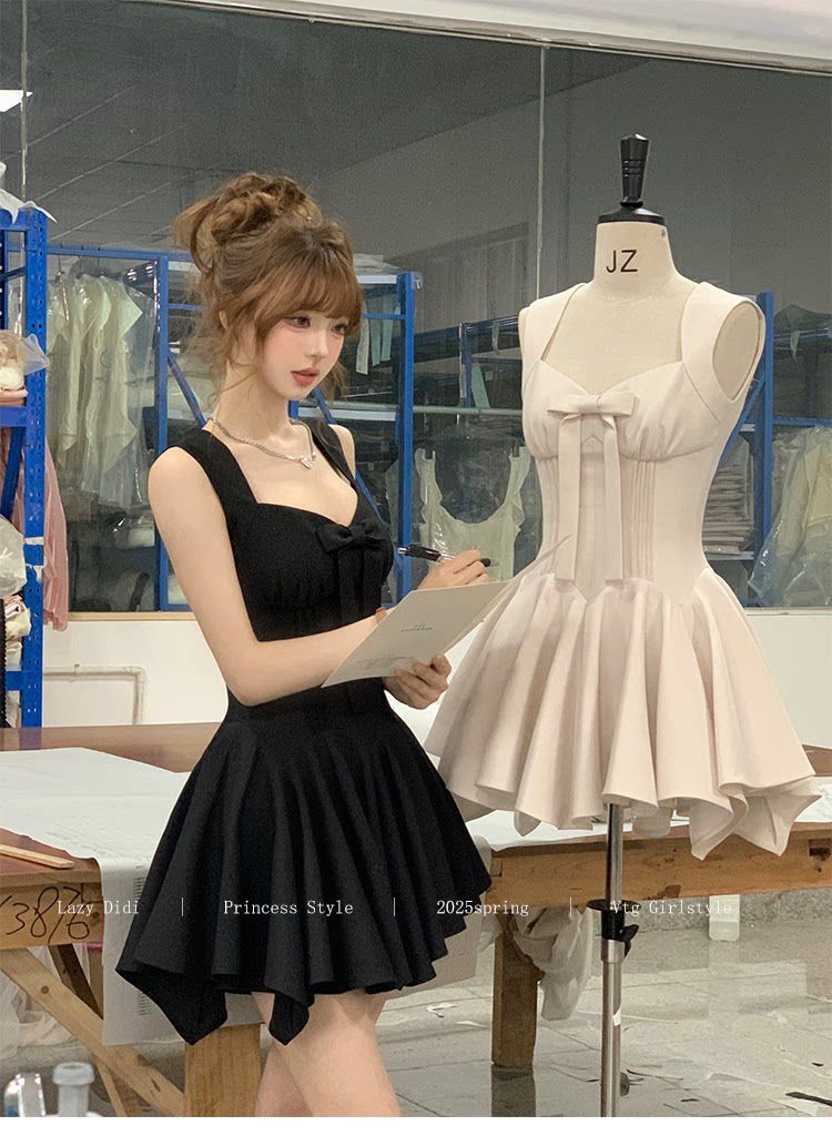 2026 여름 달콤함 한국 스타일 바람 섹시함 나비 매듭 슬립 여성 드레스 하이웨이스트 슬림해 보이는 체크무늬 퍼프 미니 스커트