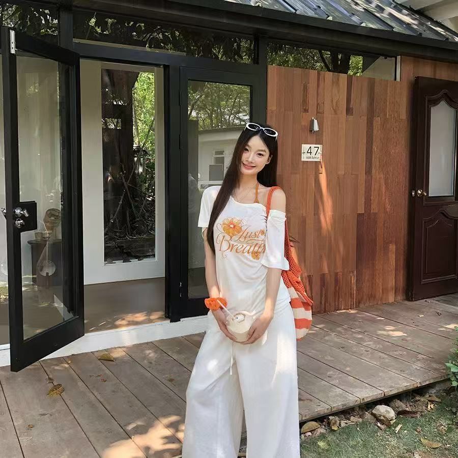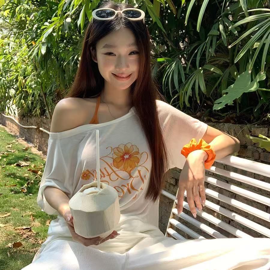 한 부서 달콤함 비스듬한 어깨 화이트 꽃무늬 프린트 반팔 티셔츠 여성 느긋한 바람 오프숄더 맨위