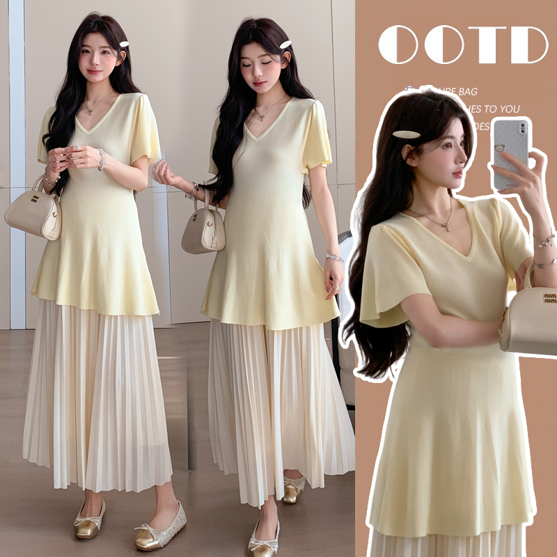 실사 지금 지금 높은 품질 얇은 스타일 차가운 센스 니트 임산부 여름 드레스 매운맛 엄마 몸매 가꾸기 V넥 임산부 드레스