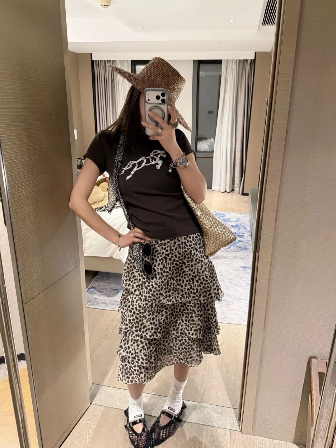 레트로 레오파드 무늬 하이웨이스트 반신 스커트 A라인 스커트 여성 의류 Chic 다용도 케이크 드레스 중간 스커트 쉬폰