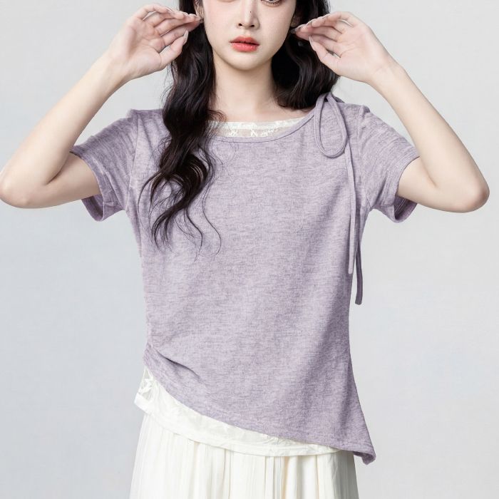 녹색 페이크 레이어드 반팔 티셔츠 여성 2026 여름 새로운 배색 레이스 조각 긍정적 인 어깨 동정 쇼트 스타일 맨위