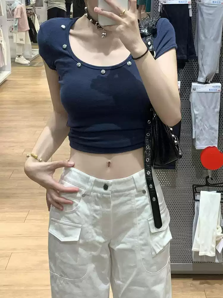 한국 스타일 핫걸 순면 반팔 티셔츠 여성 여름 새로운 디자인 센스 반 개방 칼라 단추 순수한 욕망 몸매 가꾸기 섹시함 맨위