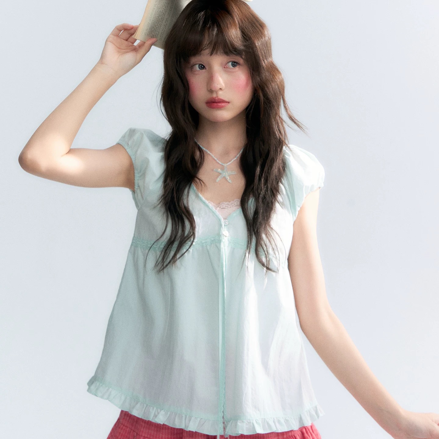 fart shop 레이스 소녀 라이 경기 서울 레이스 레이스 순수한 욕망 레이스업 티셔츠 여성 봄 여름 V넥 맨위