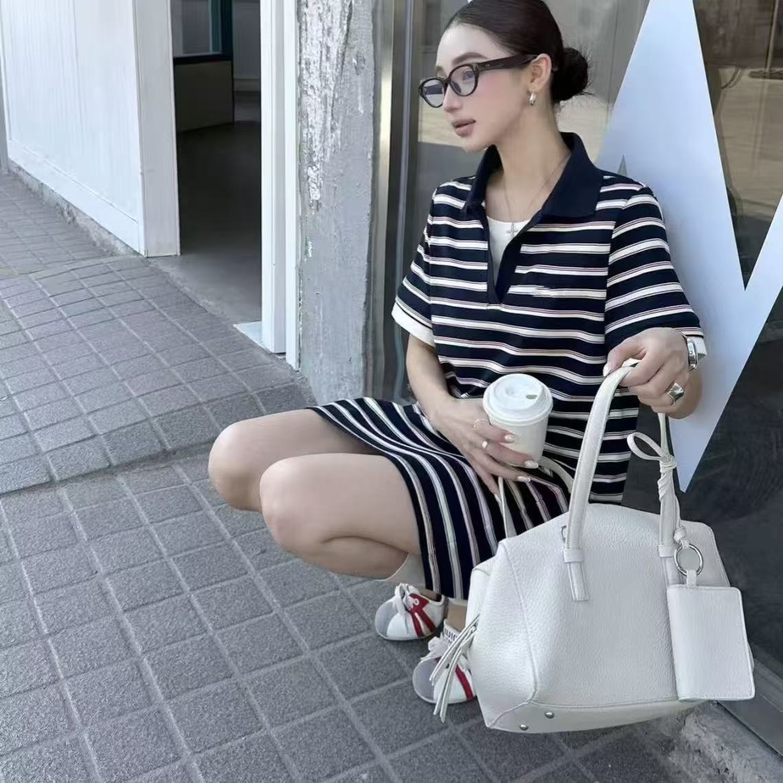 기념일 로고 맞춤 남쪽 기름 높은 품질 스트라이프 POLO 칼라 드레스 스트레이트 루즈핏 슬림해 보이는 캐주얼 느긋한 바람 미니 스커트