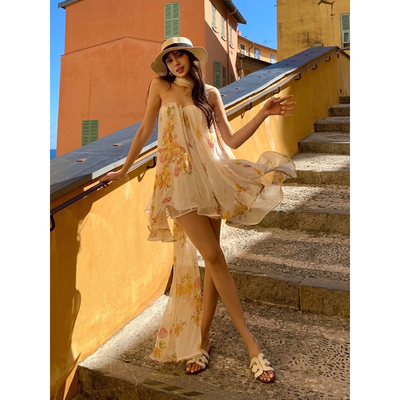 fart shop 꽃 리플 꽃 바다 V넥 스트랩 백리스 슬립 여성 드레스 봄 여름 레이스 수정 치마