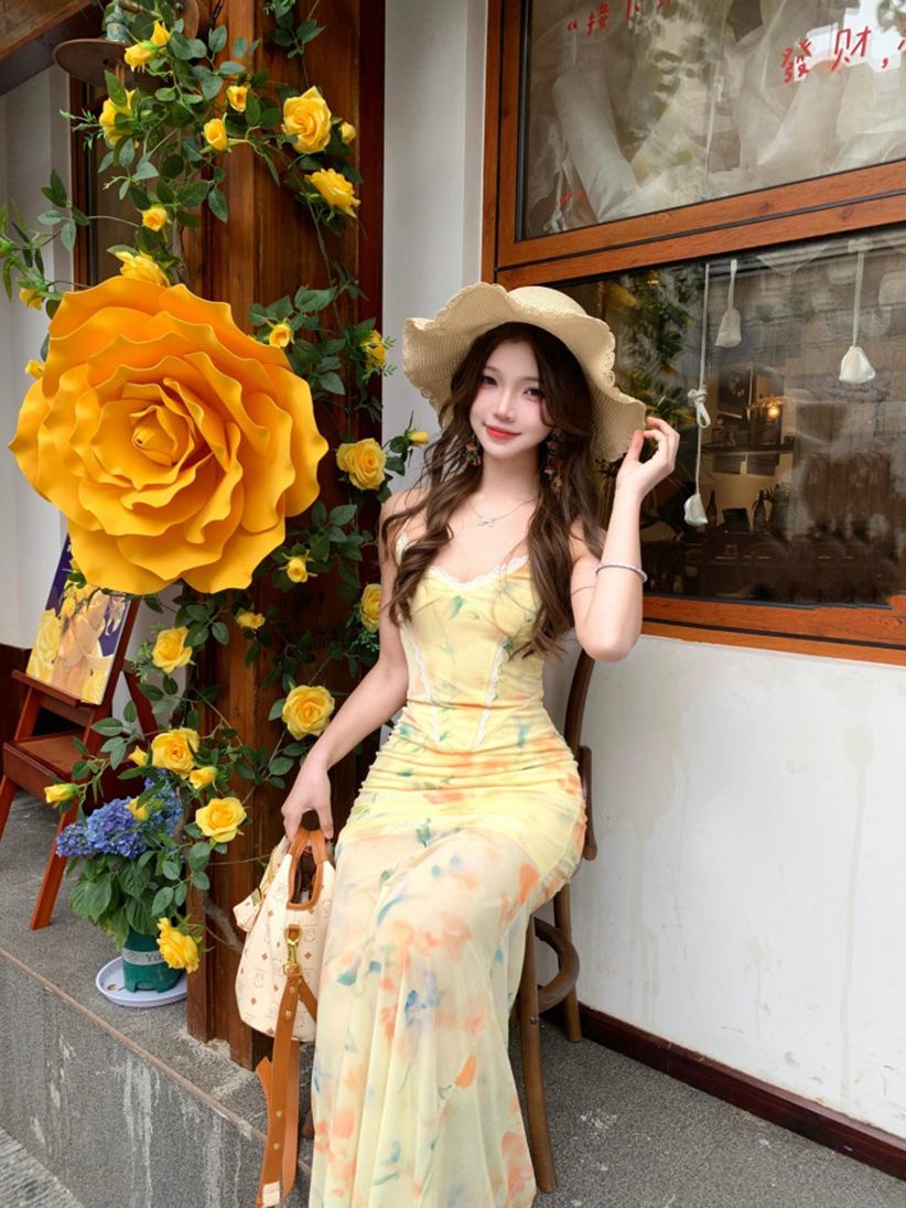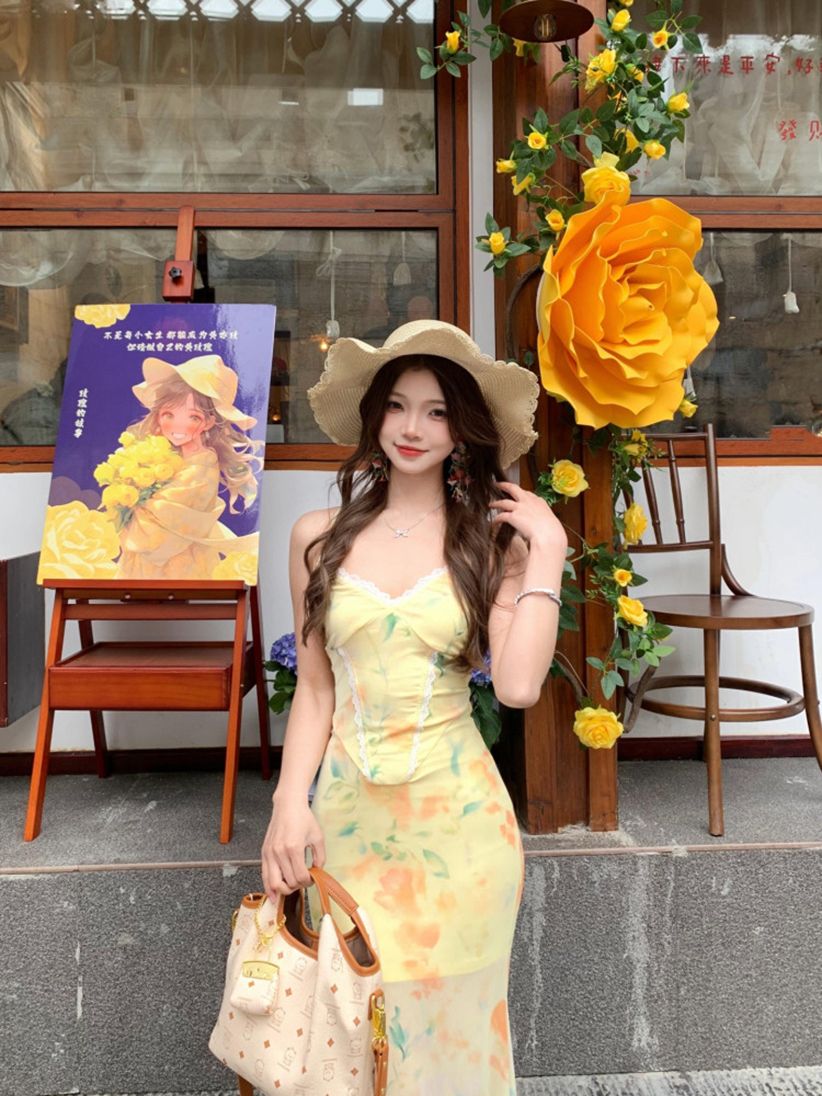 휴가 바람 스트랩 백리스 슬립 여성 드레스 여름 꽃무늬 치마 핫걸 허리 수축 인어 꼬리 치마 타이트 스커트 롱 스커트