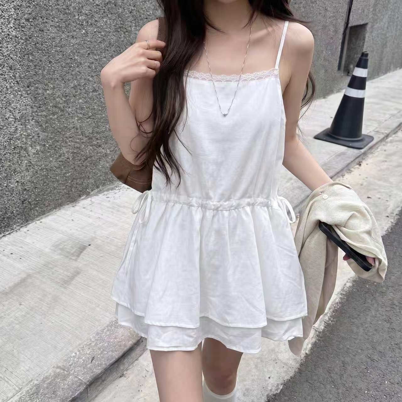 chic 2026 여름 외국 가스 레이스 측면 V넥 불규칙 슬립 드레스