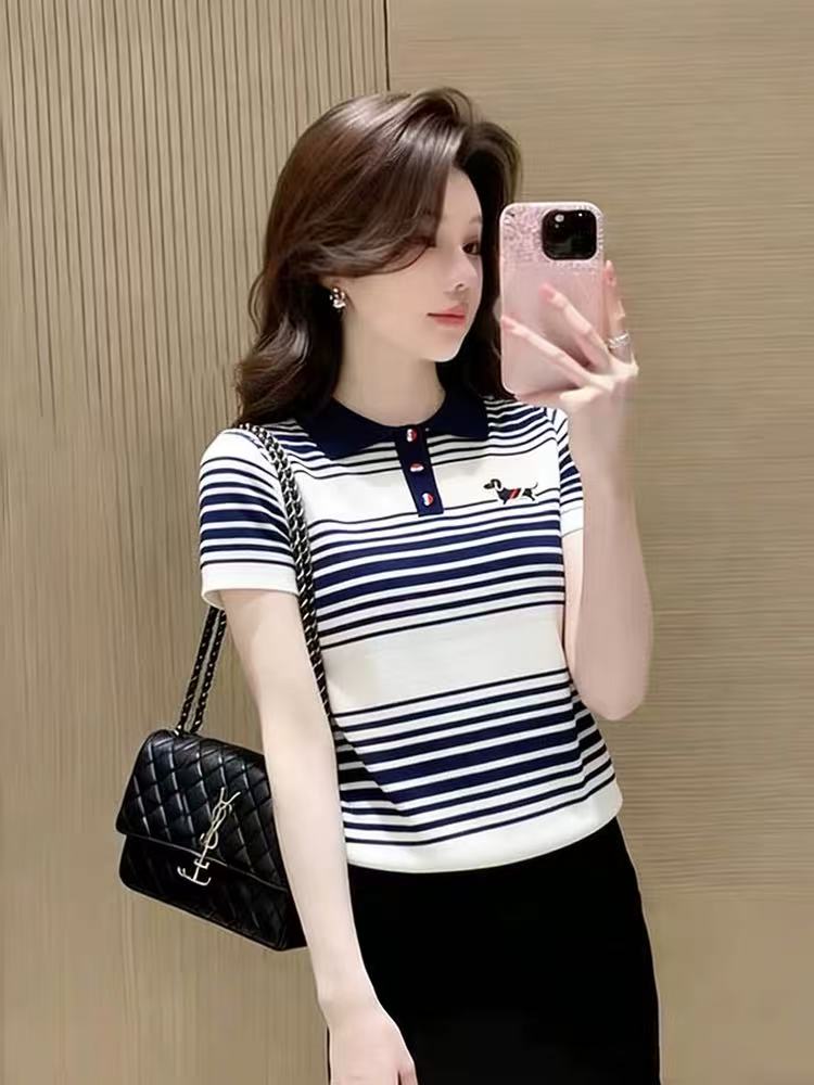 올해 인기 ~ 중 폭발 여성 의류 여름 2026 새로운 스트라이프 POLO 칼라 얼음 실크 반팔 니트 티셔츠 맨위