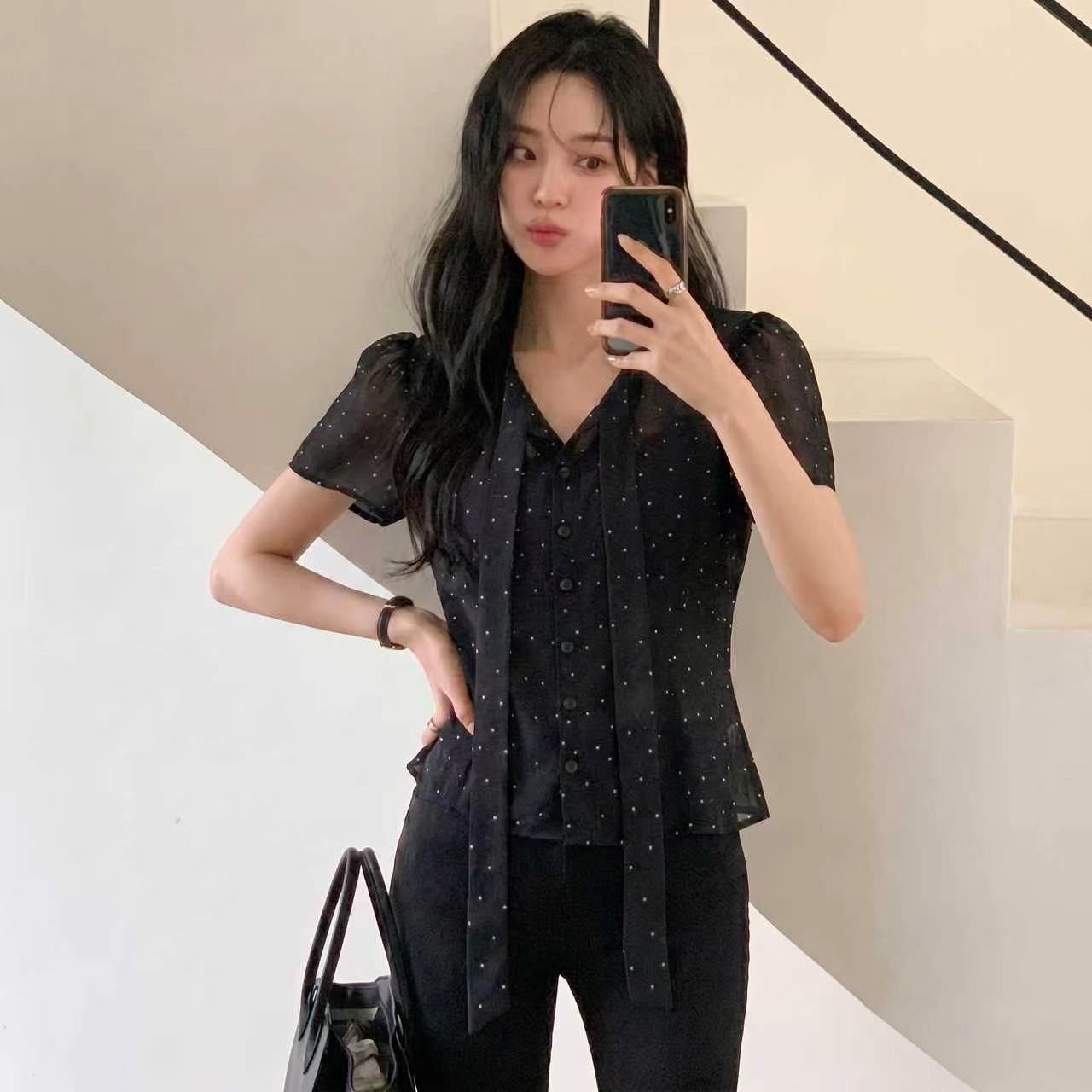 재고 있음 한국 동대문 2026 새로운 한국 스타일 쉬폰 도트 무늬 레이스업 맨위 블라우스