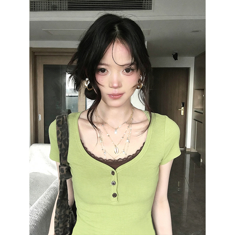 프랑스 좋은 리브 녹색 페이크 레이어드 긍정적 인 어깨 반팔 여성 여름 패치워크 레이스 라운드 넥 티셔츠 몸매 가꾸기 핫걸 맨위