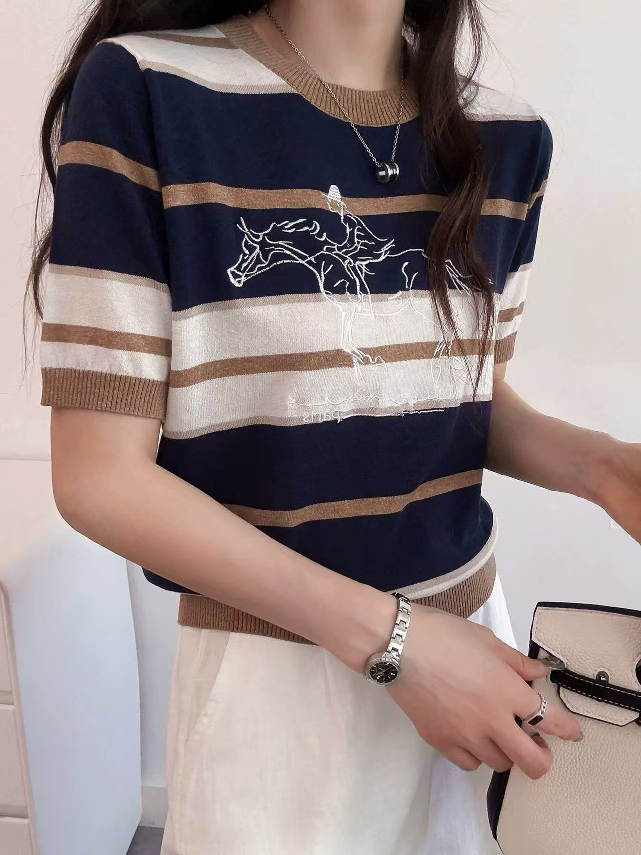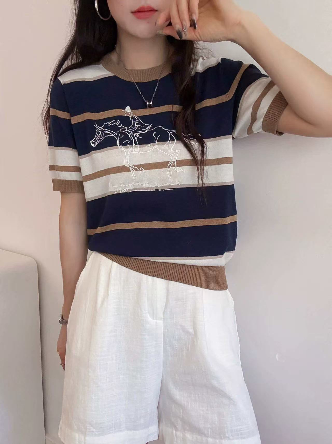 말 타기 펜티엄 그림 자수 배색 스트라이프 반팔 니트 스웨터 티셔츠 여성 26 여름 얇은 스타일 주간 실크 아마 맨위