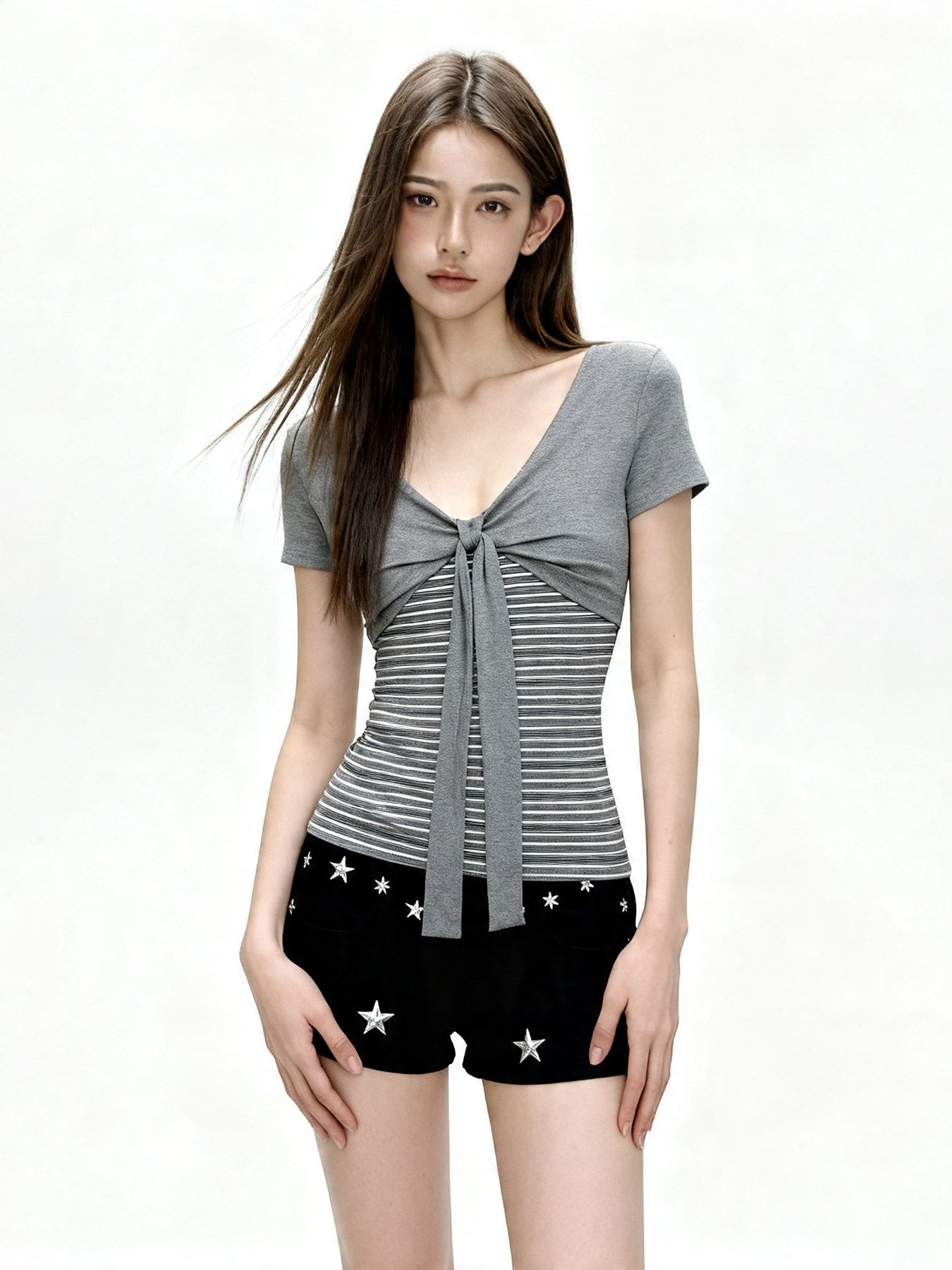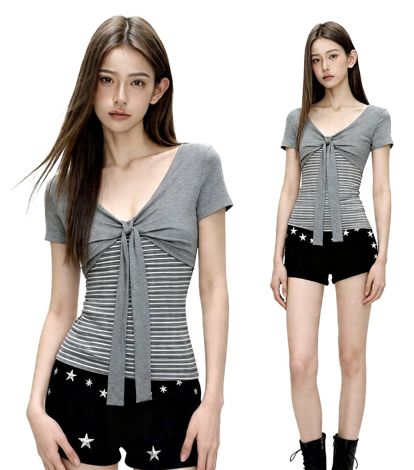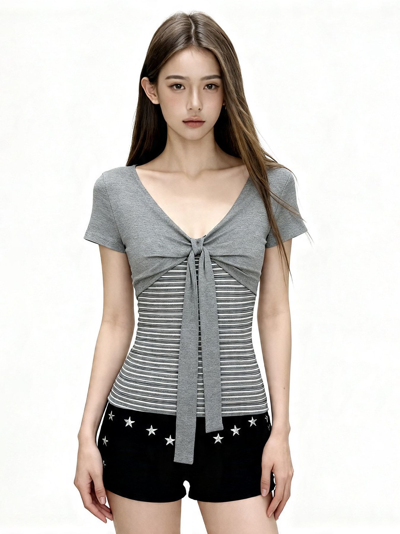 배색 스트라이프 패치워크 나비 매듭 V넥 반팔 티셔츠 여성 여름 2026 새로운 핫걸 몸매 가꾸기 Chic