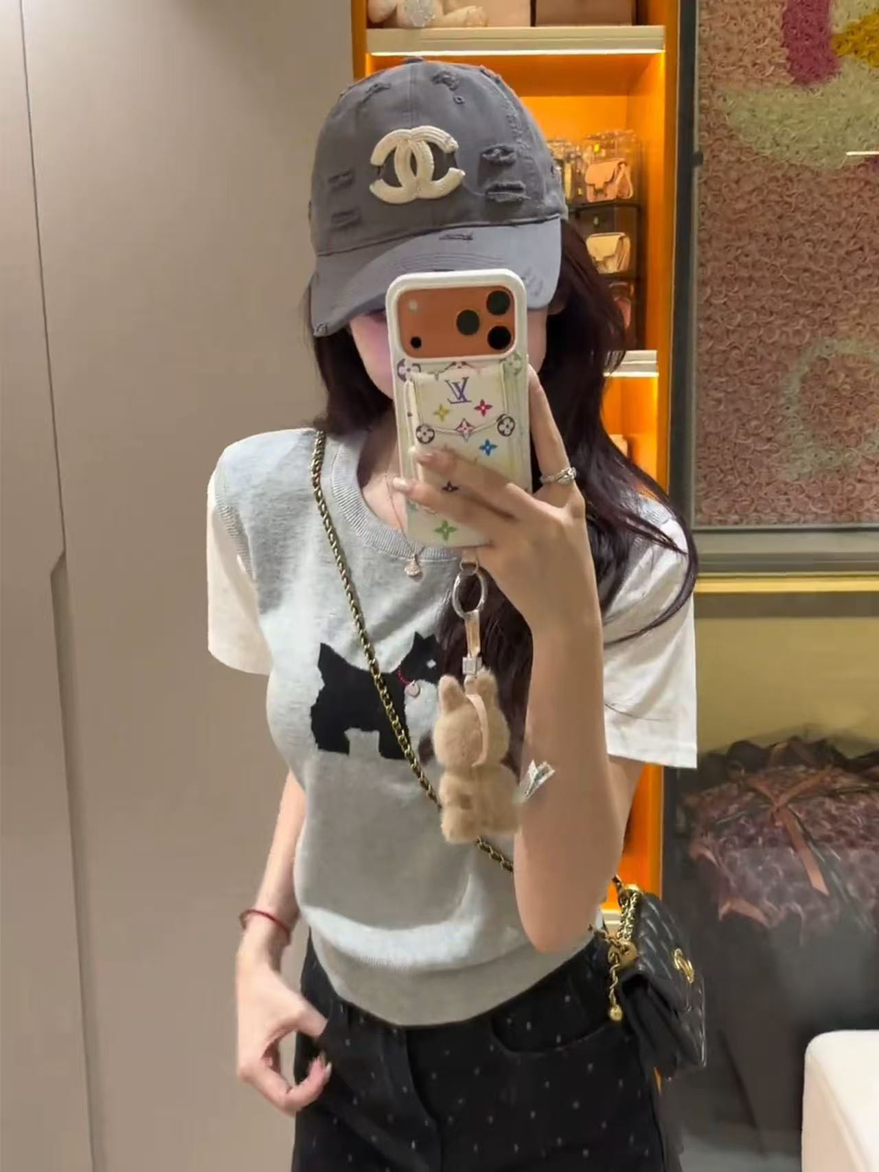 한 부서 검정색 강아지 페이크 레이어드 니트 반팔 티셔츠 여성 여름 디자인 센스 작은 대중 고유 한 아름다운 맨위 서비스