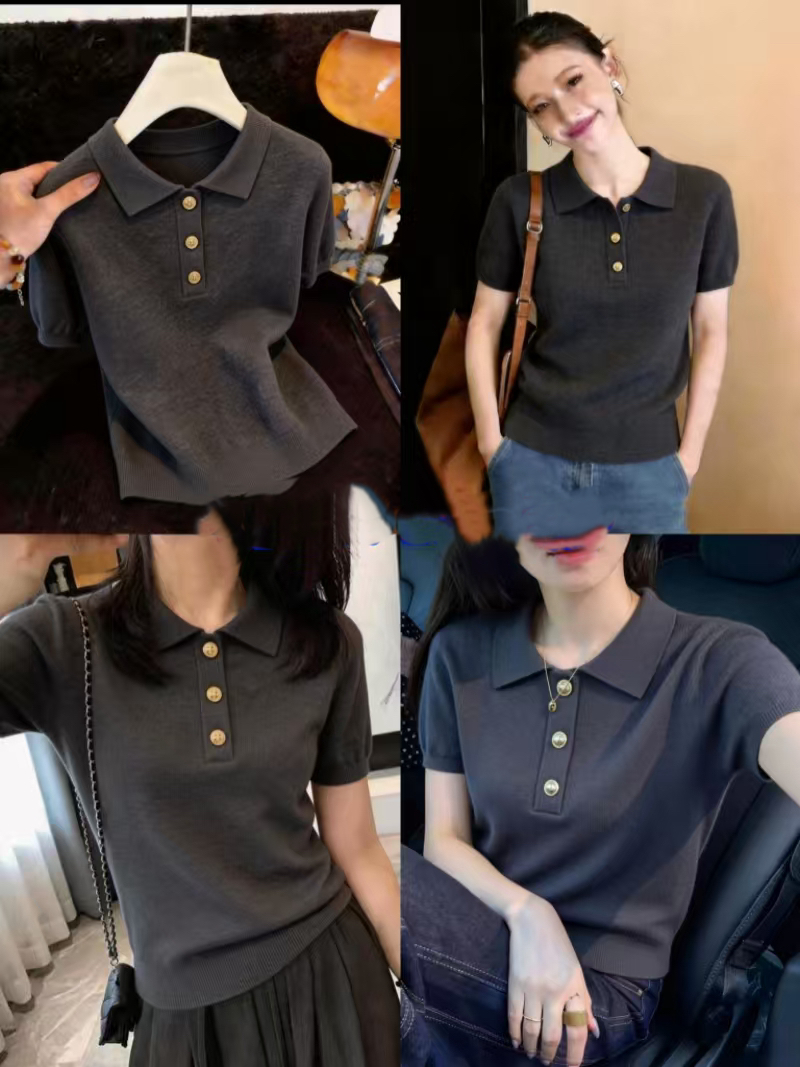 2026 새로운 폴로 칼라 단추 홀로우 아웃 품격 슬림해 보이는 고급 센스 외국 가스 반팔 티셔츠 니트 스웨터 맨위 여성