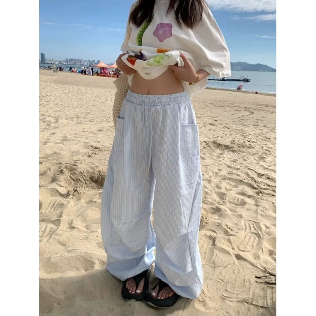 한 부서 파란색 스트라이프 캐주얼 바지 여성 여름 디자인 센스 슬림해 보이는 루즈핏 느긋한 바람 운동 와이드 레그 팬츠 롱 바지