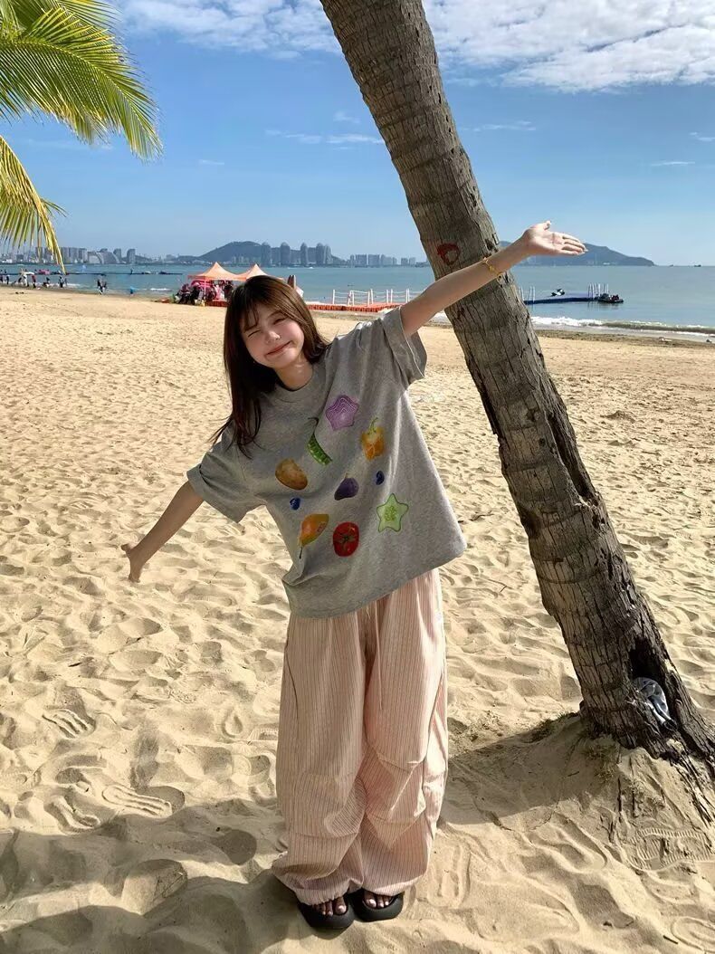 없음 펜던트 후아 면 복합 여름 전체 인쇄 별 루즈핏 와이드 레그 팬츠 다용도 운동 바지
