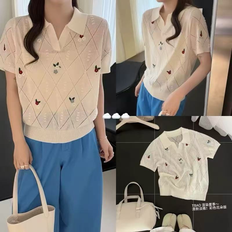 한 부서 자수 홀로우 아웃 폴로 칼라 얼음 실크 니트 반팔 여성 여름 외출용 고급 센스 슬림해 보이는 POLO 셔츠 미니멀리즘 맨위