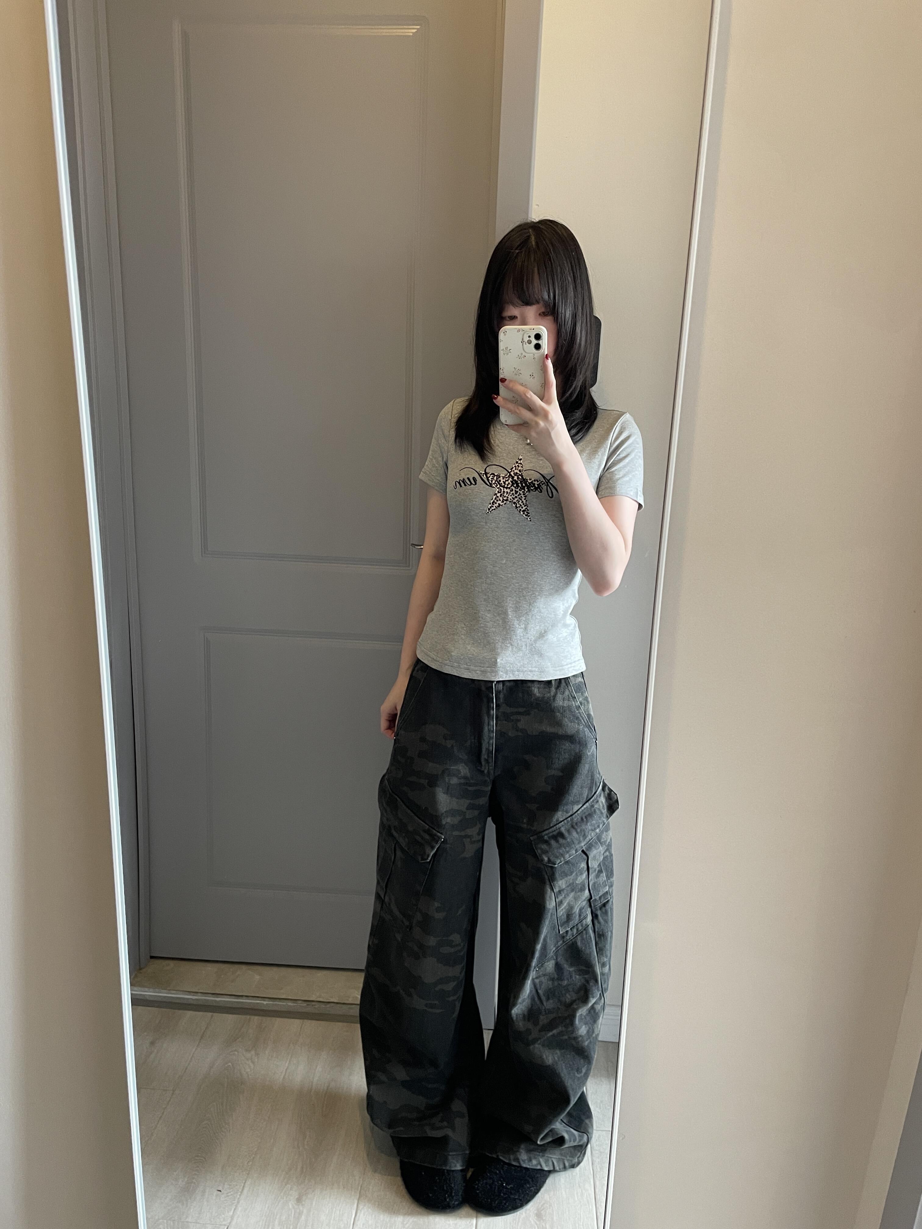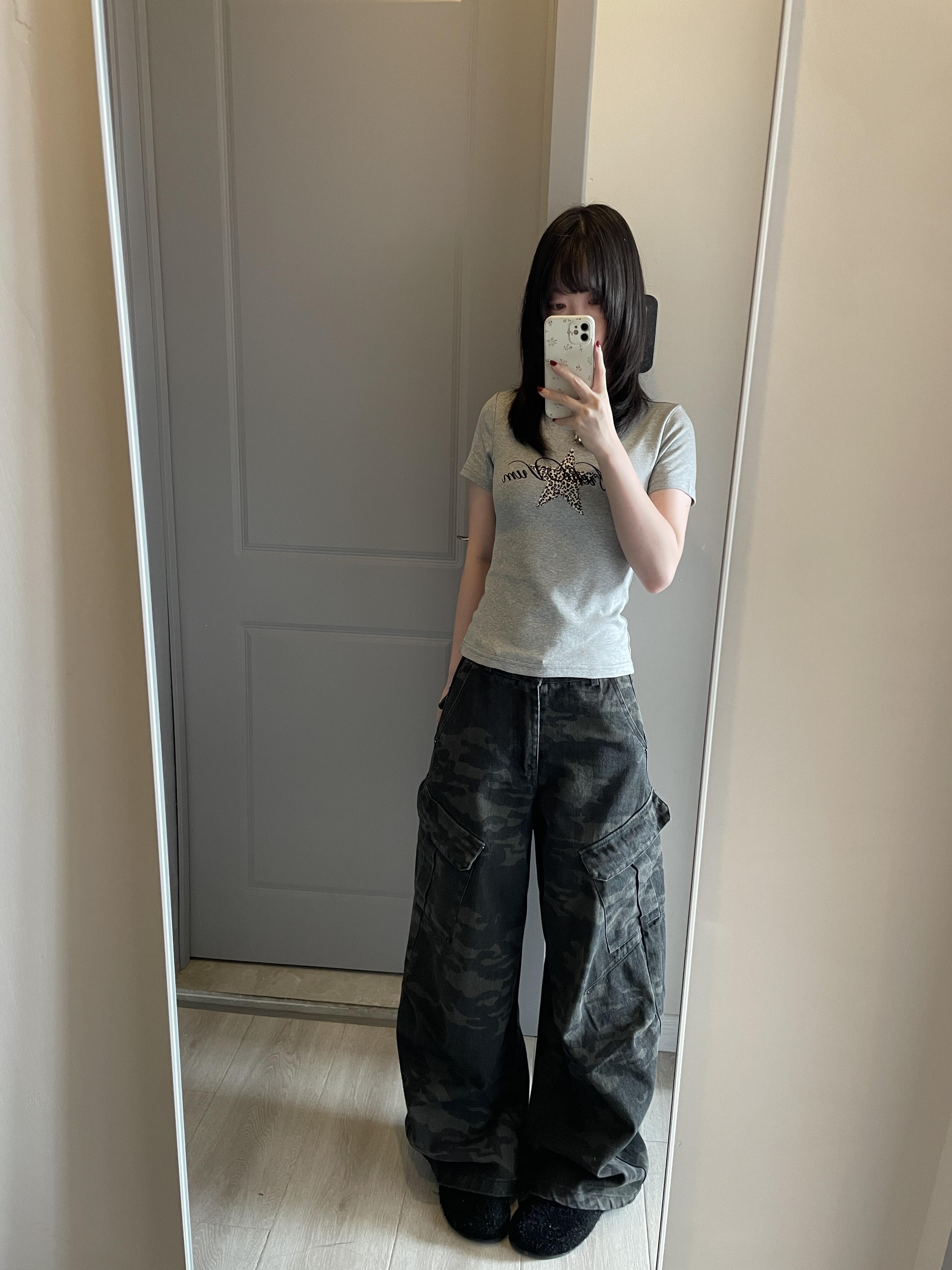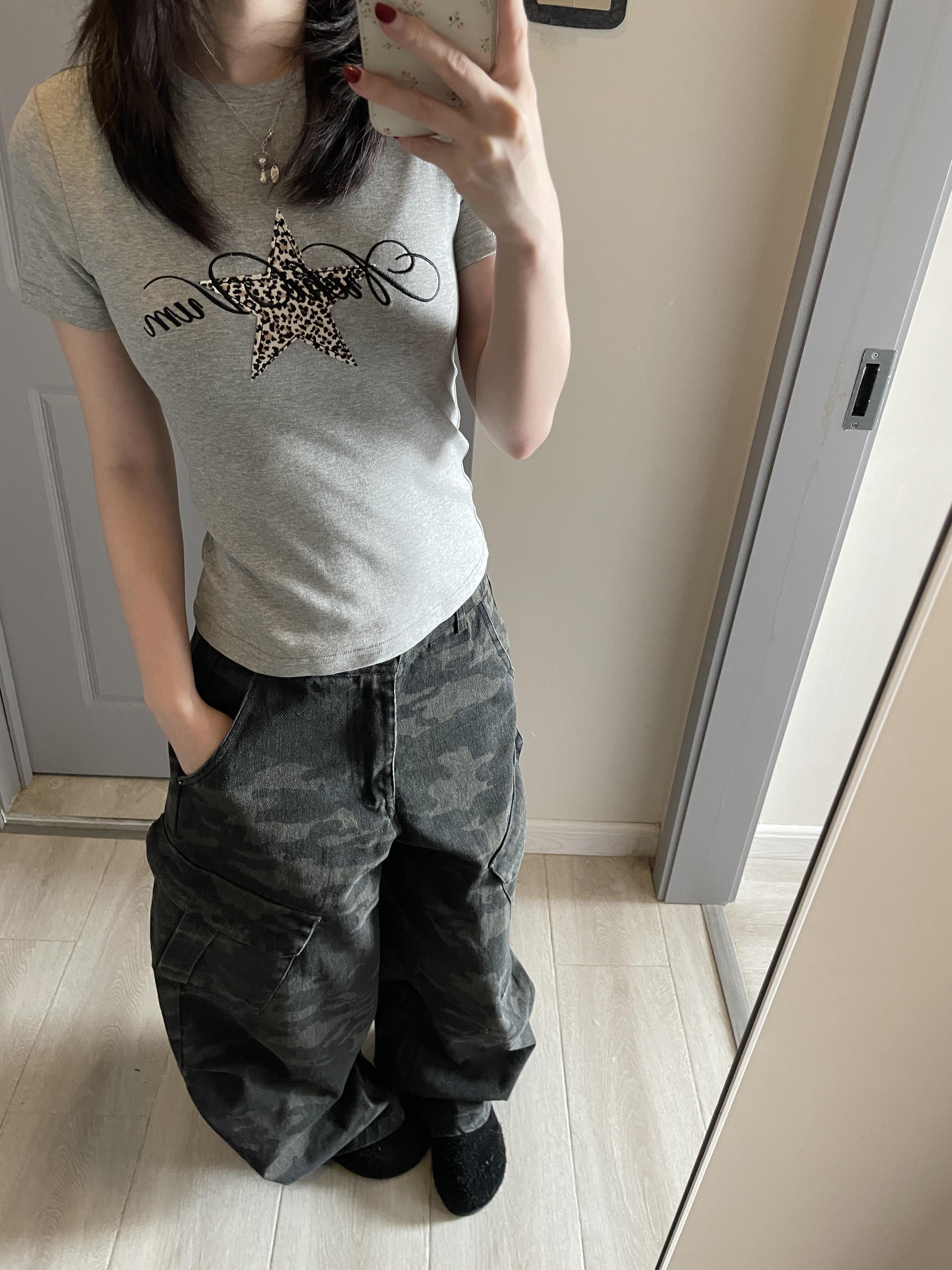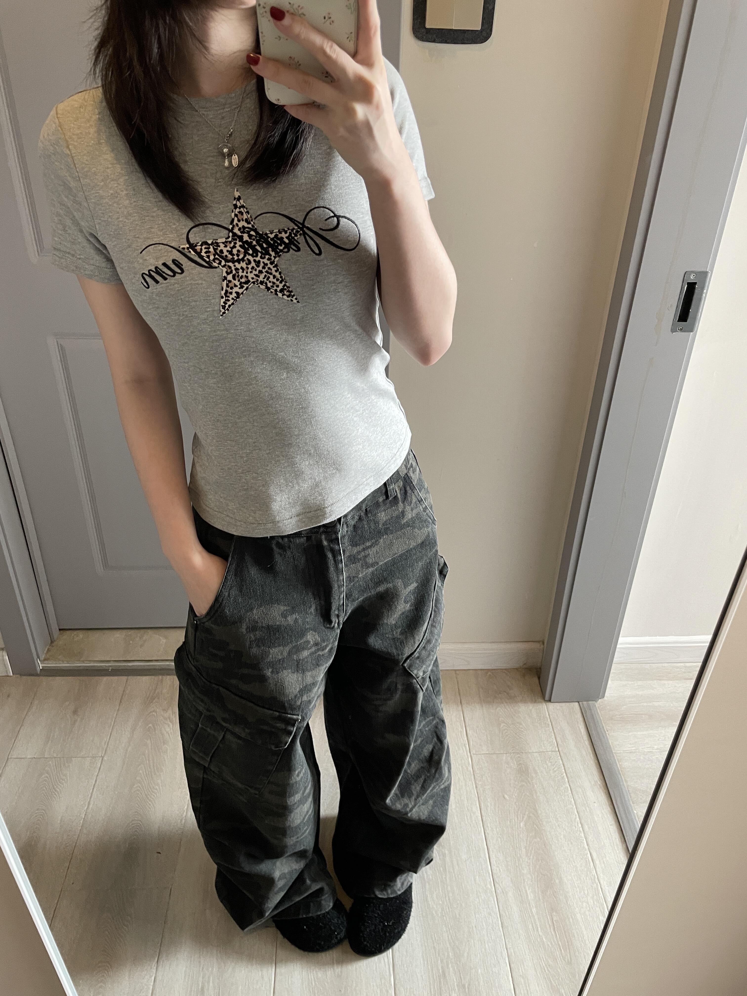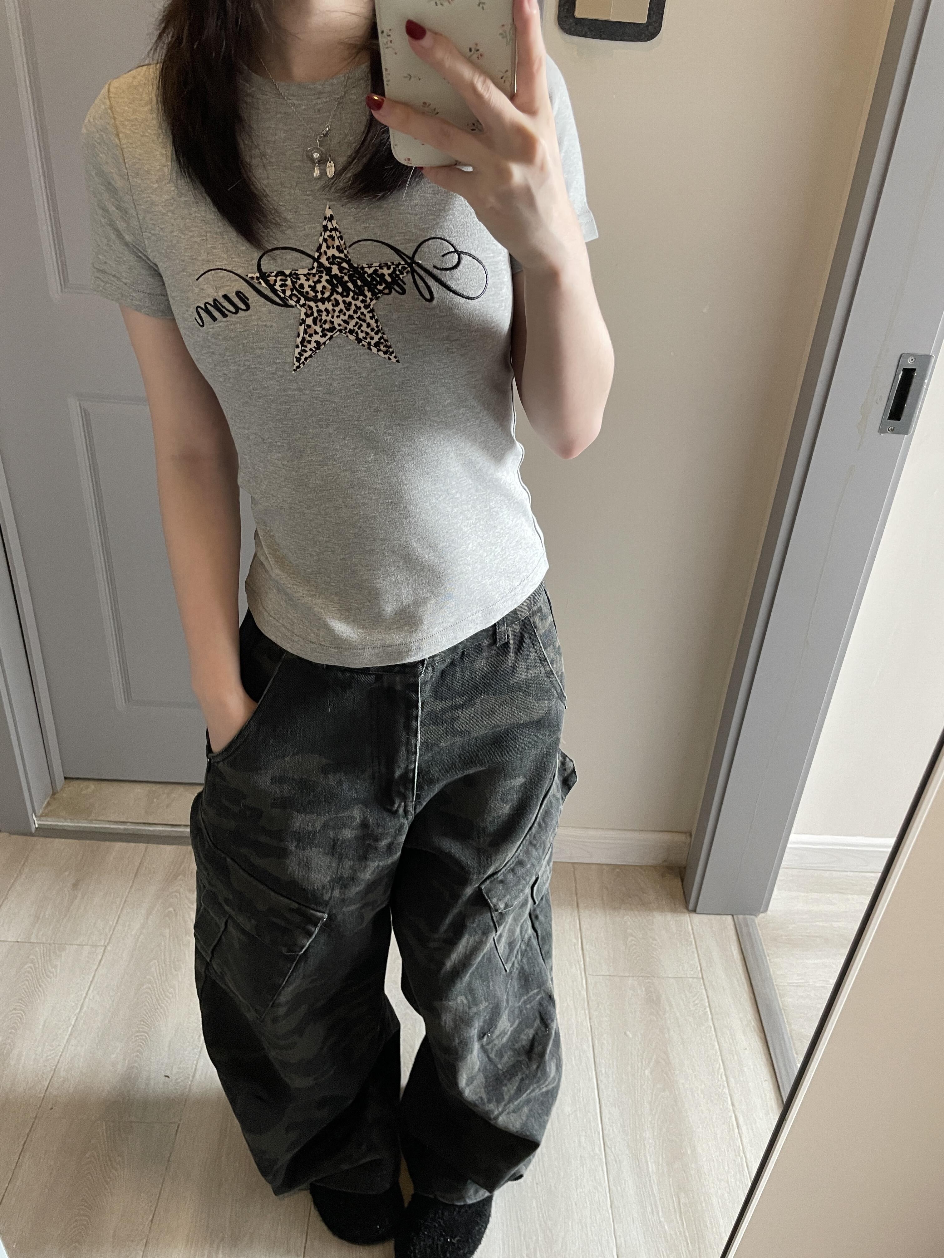 레오파드 무늬 별 회색 반팔 티셔츠 여성 2026 새로운 봄 여름 착용 가져 가라. 긍정적 인 어깨 몸매 가꾸기 맨위 아메리칸 핫걸