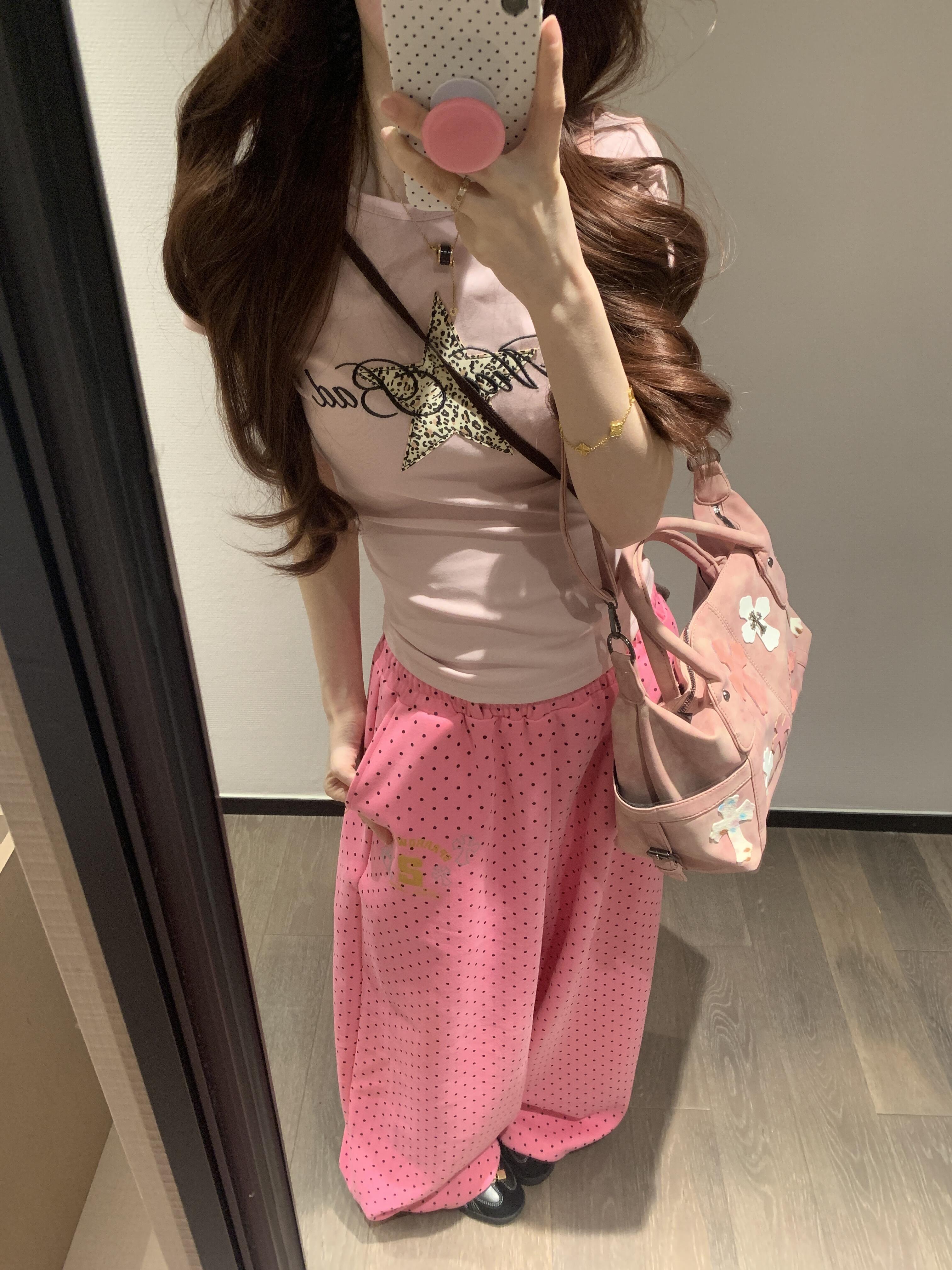 레오파드 무늬 별 프린트 핑크색 반팔 티셔츠 여성 여름 2026 새로운 몸매 가꾸기 슬림해 보이는 쇼트 스타일 한 첨부 된 의류 트렌디
