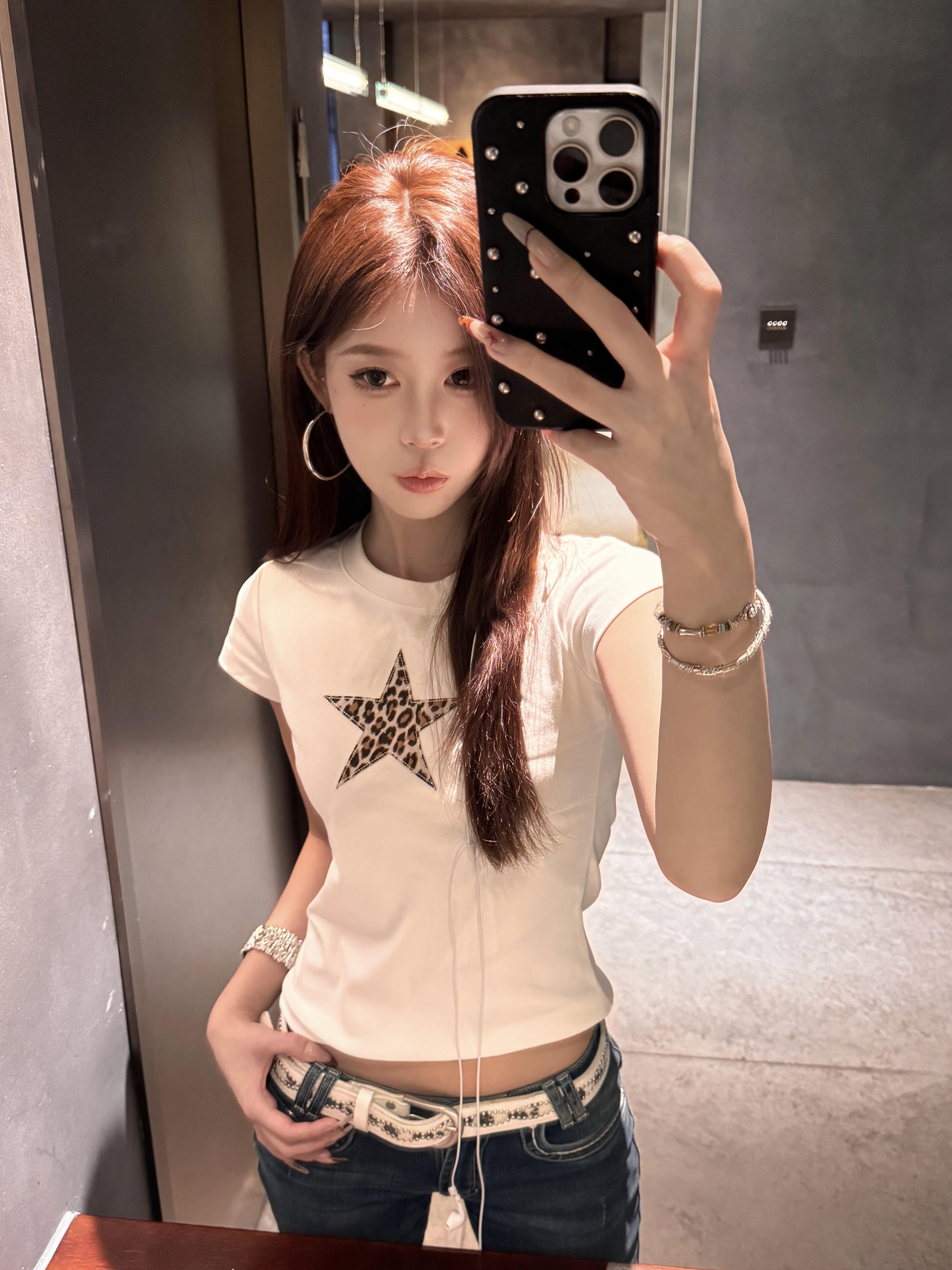 아메리칸 레트로 핫걸 레오파드 무늬 요소 별 반팔 티셔츠 여성 여름 몸매 가꾸기 슬림해 보이는 화이트 슈퍼 화재로 의류