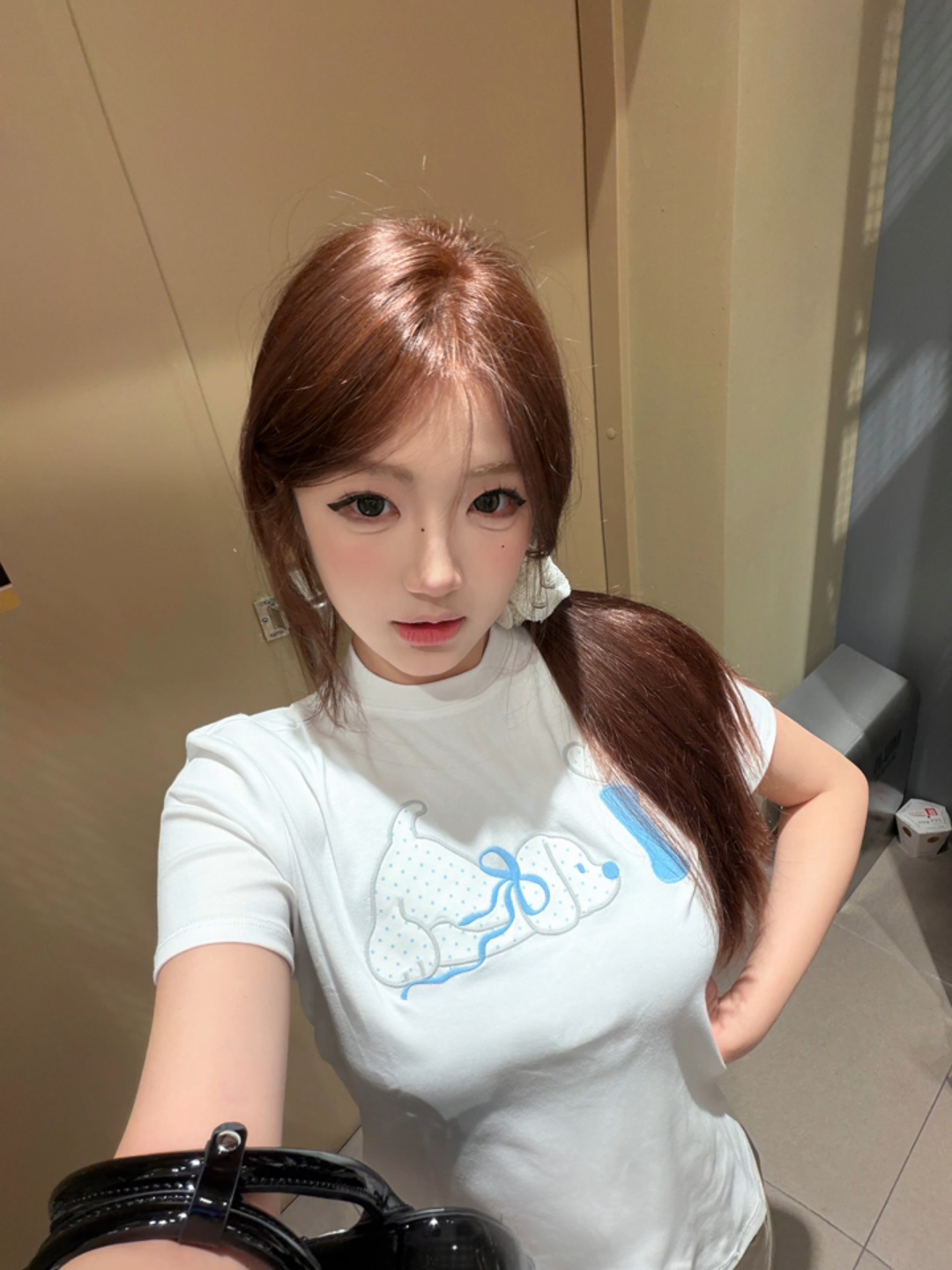 한 부서 레트로 패치 도트 무늬 강아지 자수 긍정적 인 어깨 반팔 티셔츠 여성 여름 몸매 가꾸기 슬림해 보이는 느긋한 센스 맨위