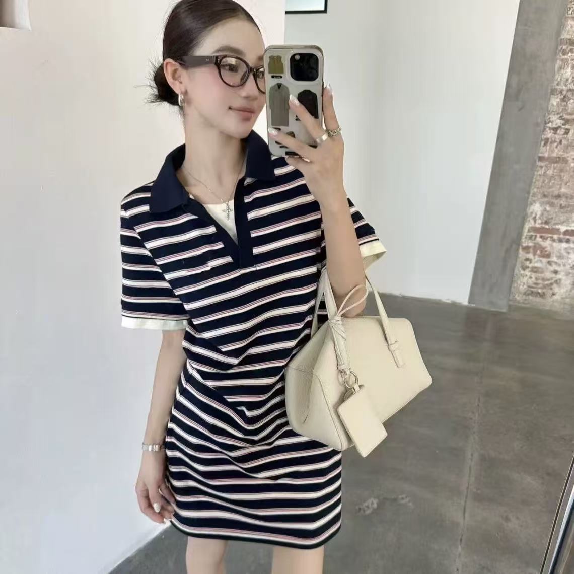 기념일 로고 맞춤 남쪽 기름 높은 품질 스트라이프 POLO 칼라 드레스 스트레이트 루즈핏 슬림해 보이는 캐주얼 느긋한 바람 미니 스커트
