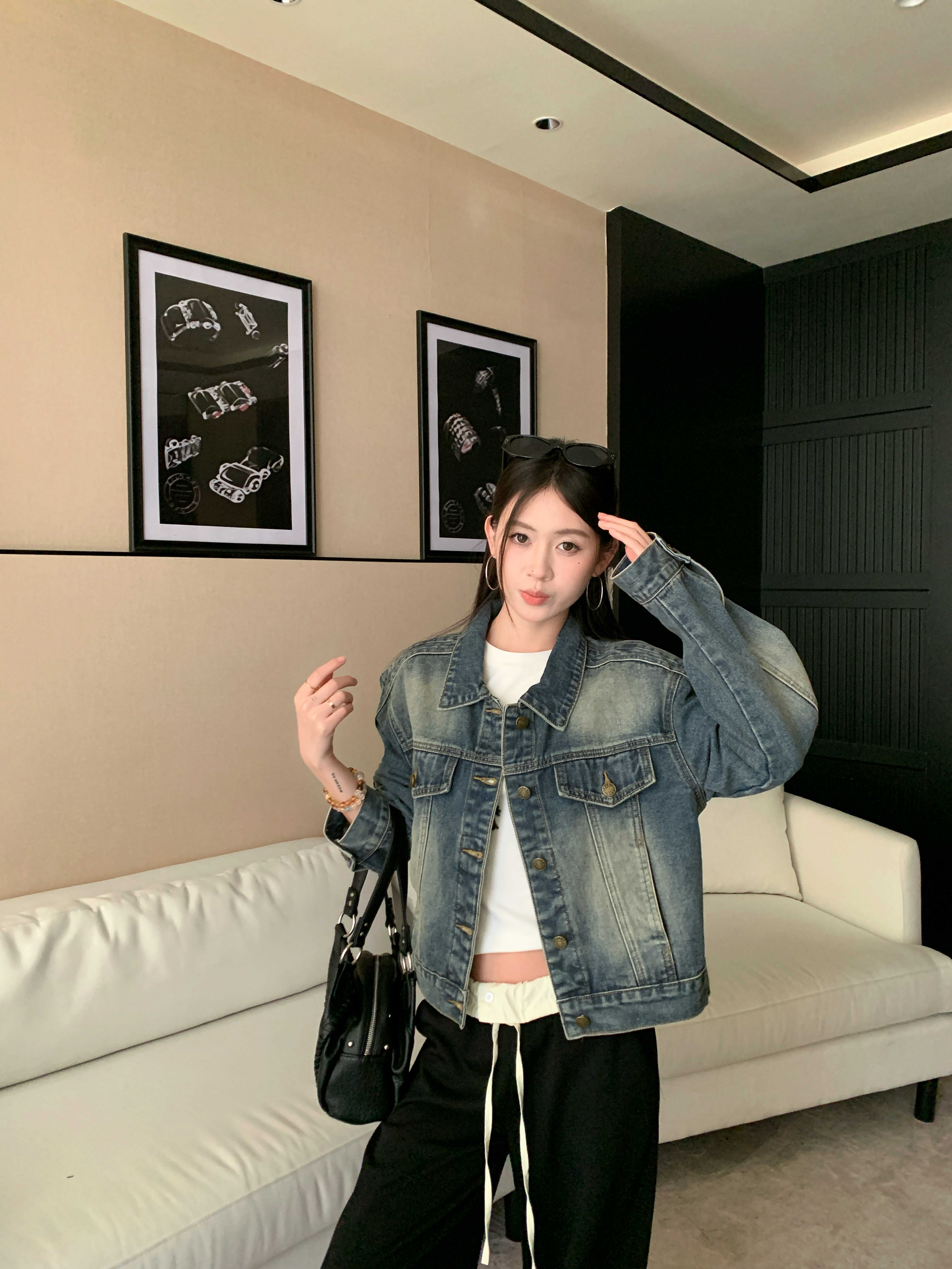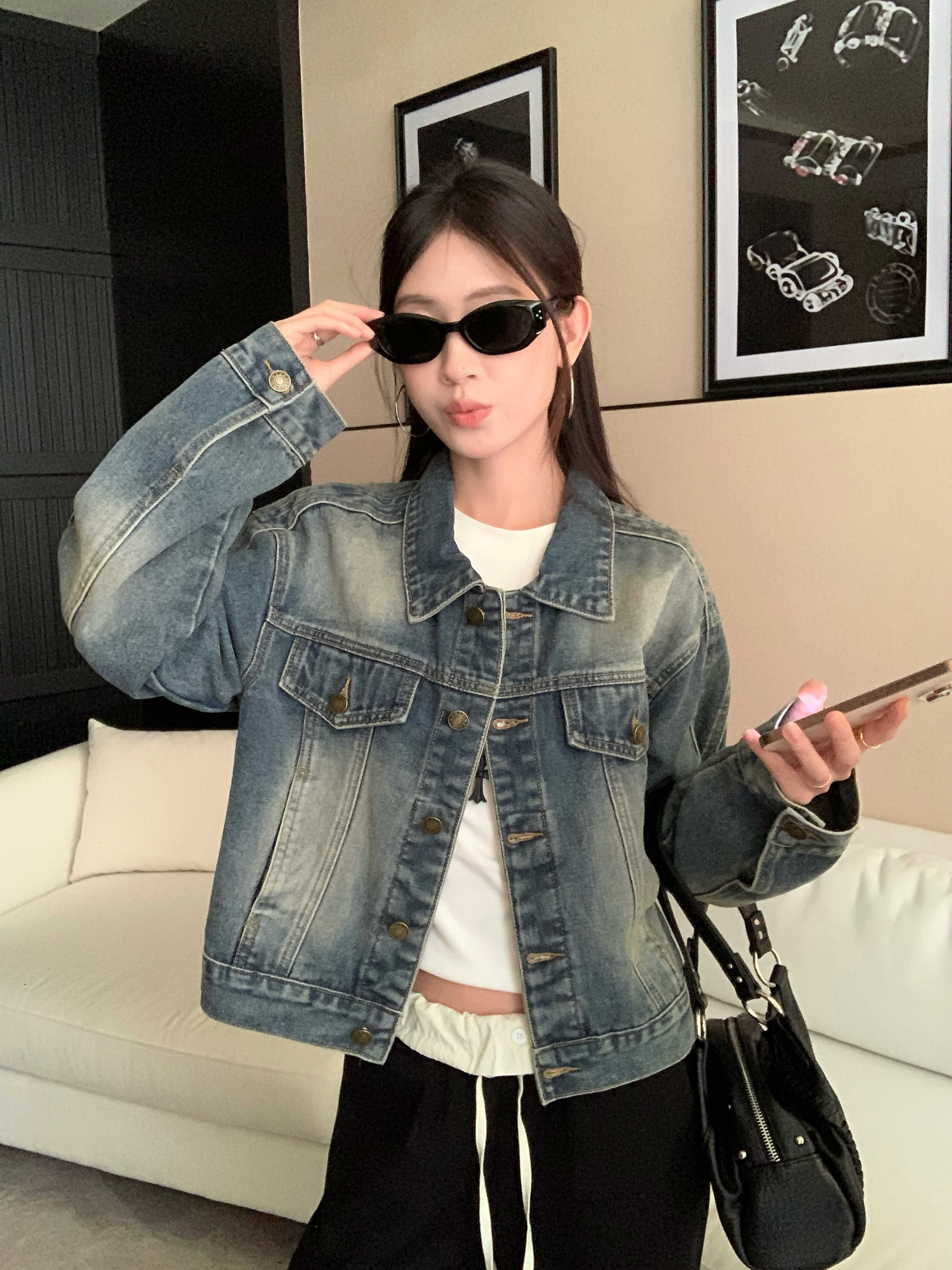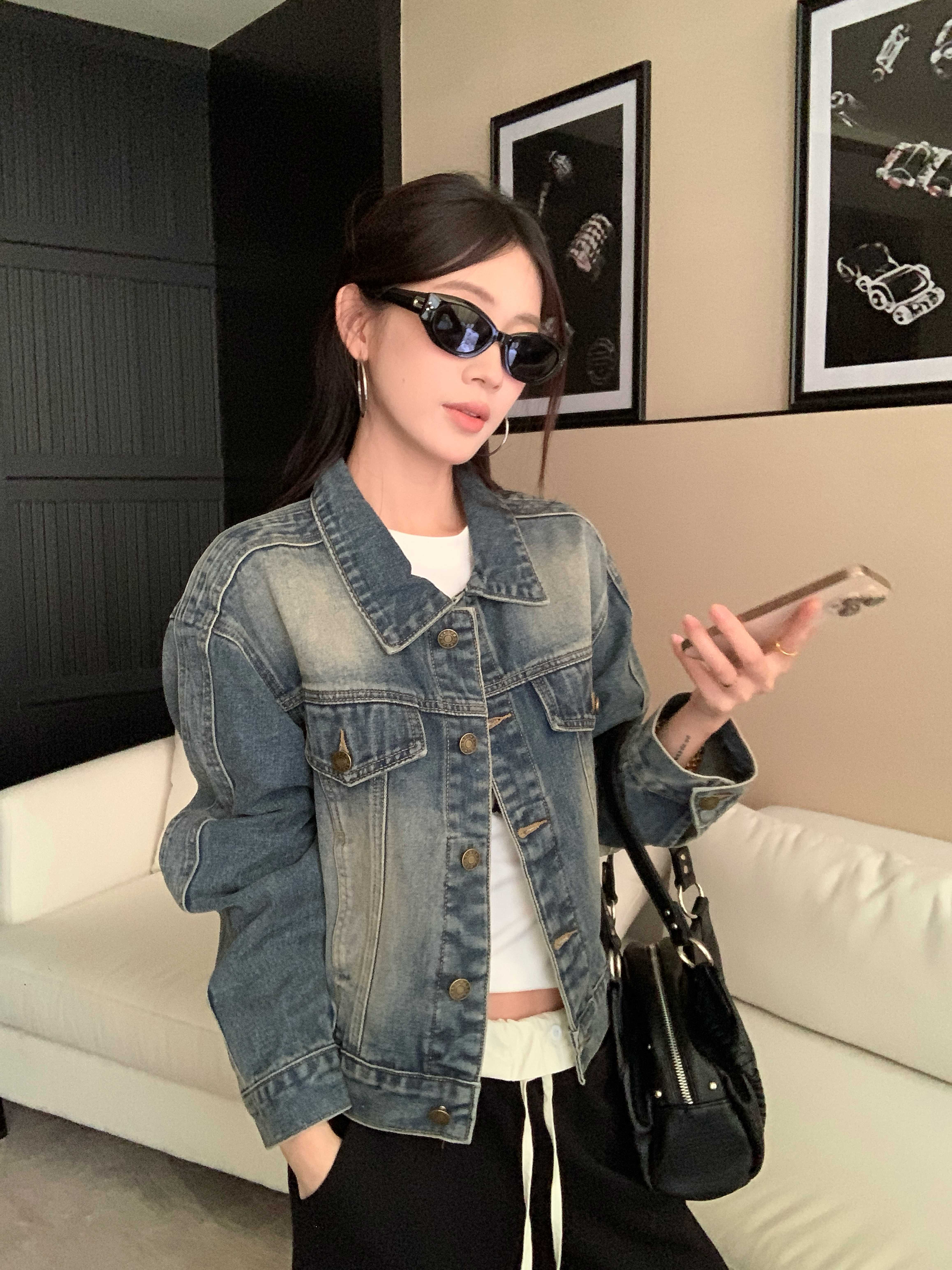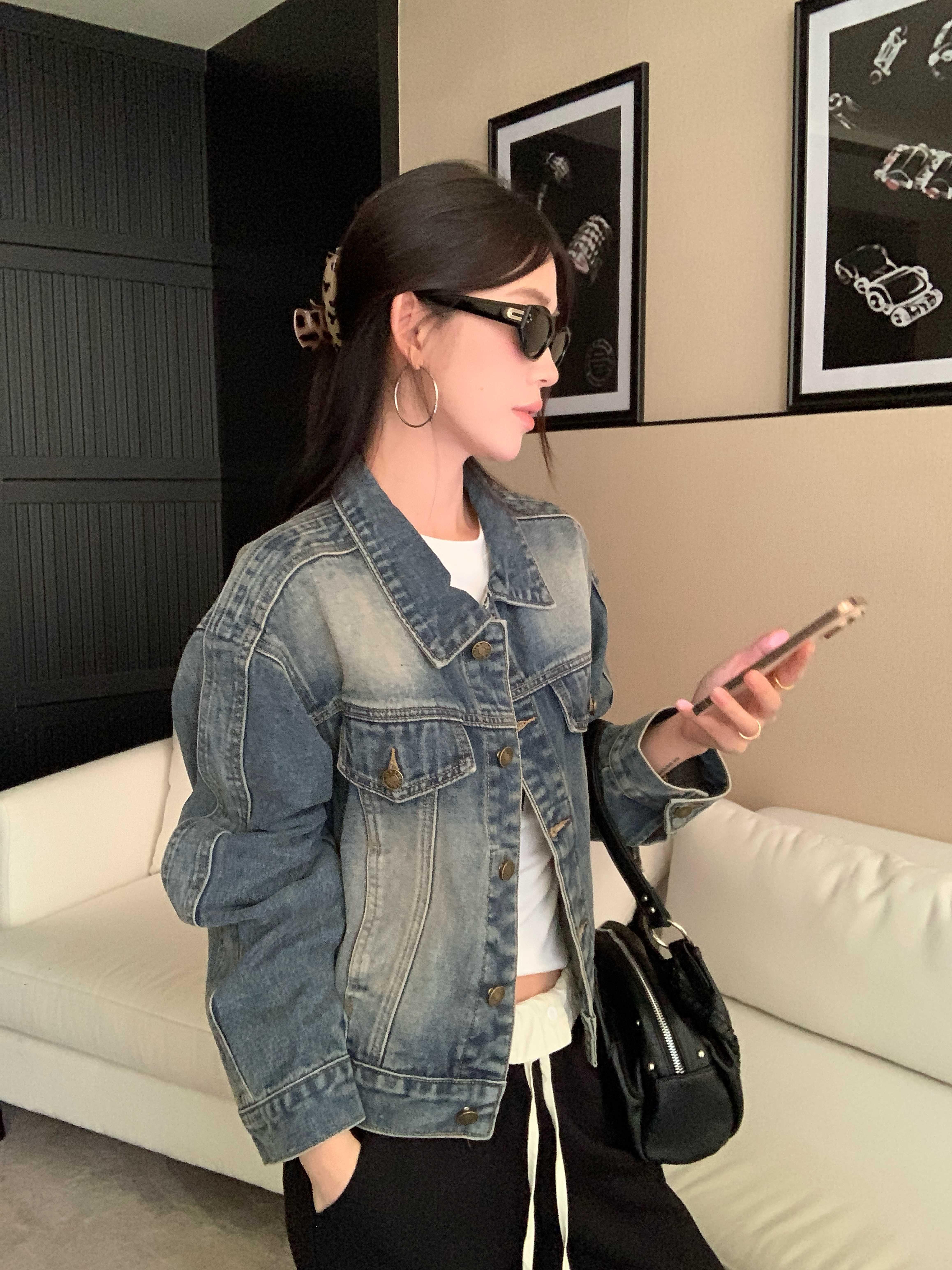 아메리칸 레트로 해체 질감 데님 재킷 루즈핏 프로필 모양 몸매 가꾸기 슬림해 보이는 워크웨어 재킷 여성