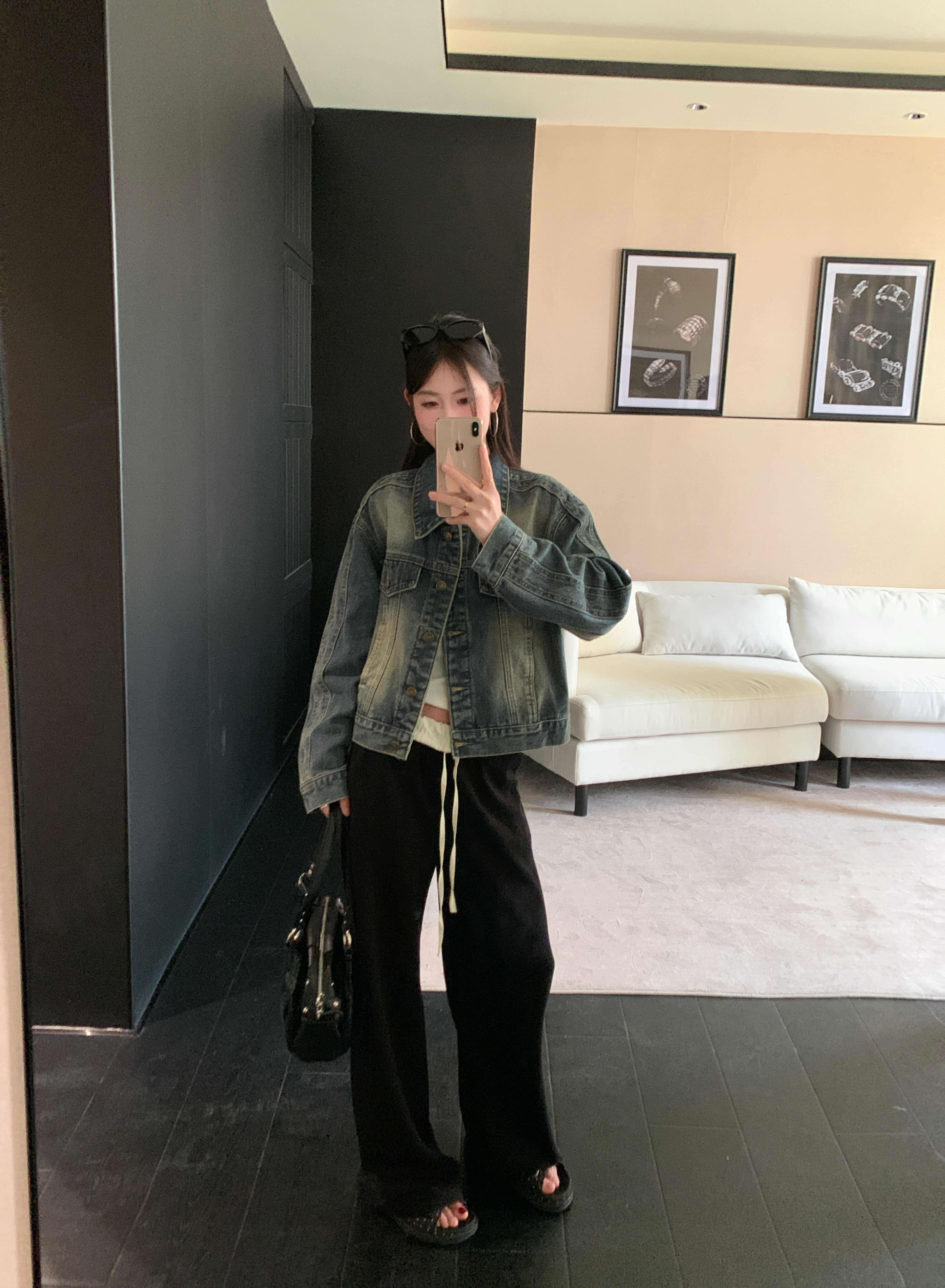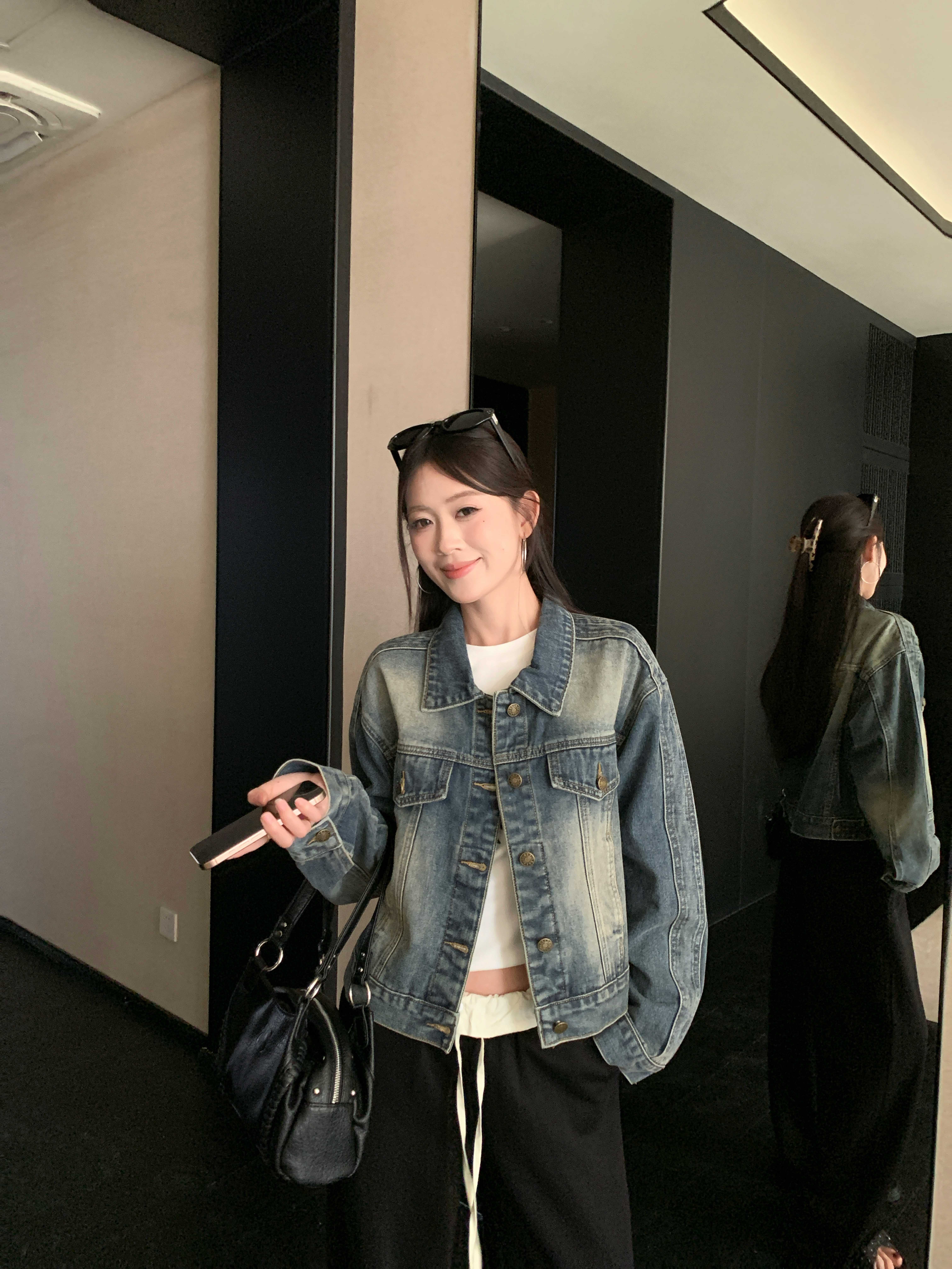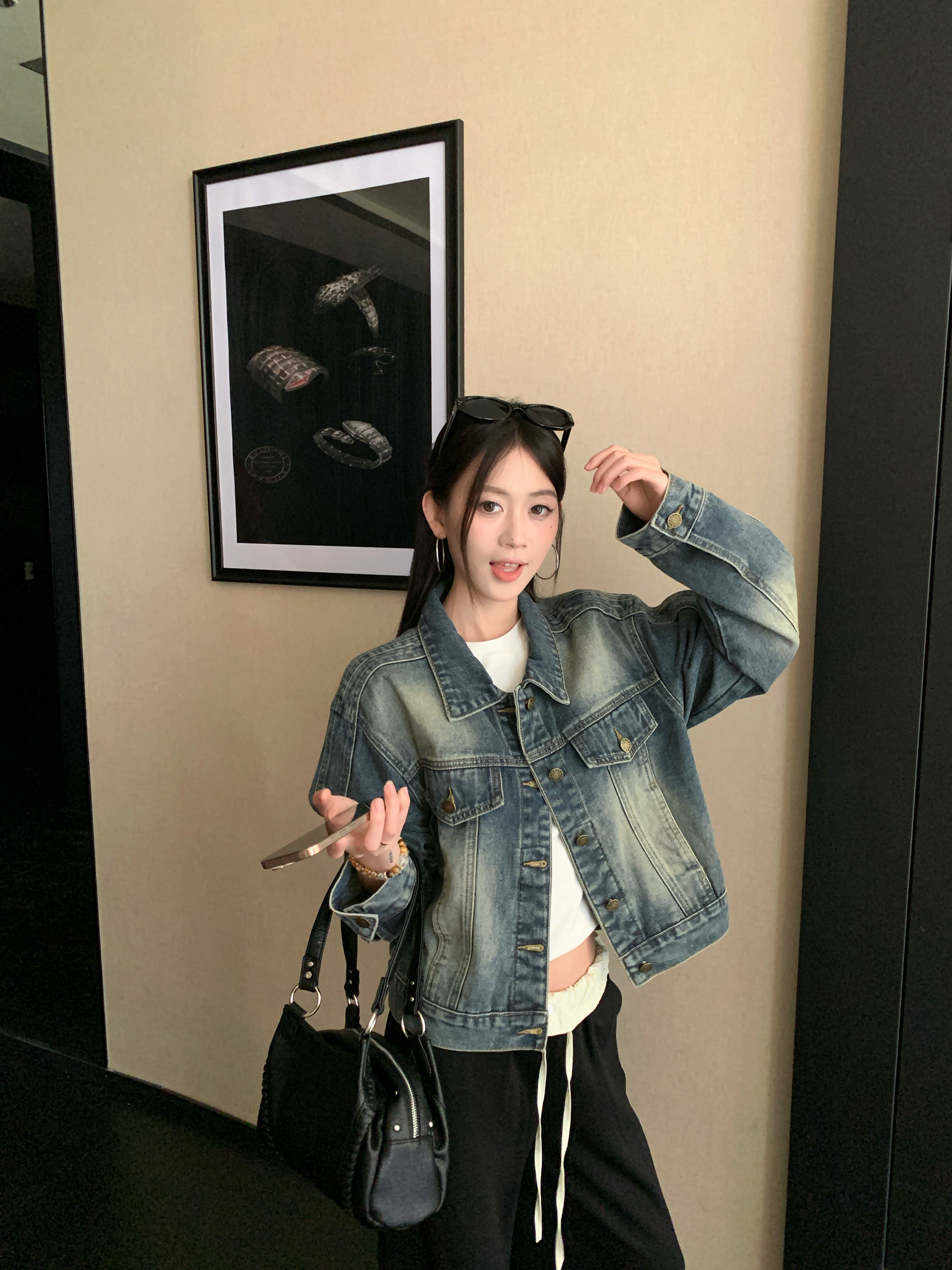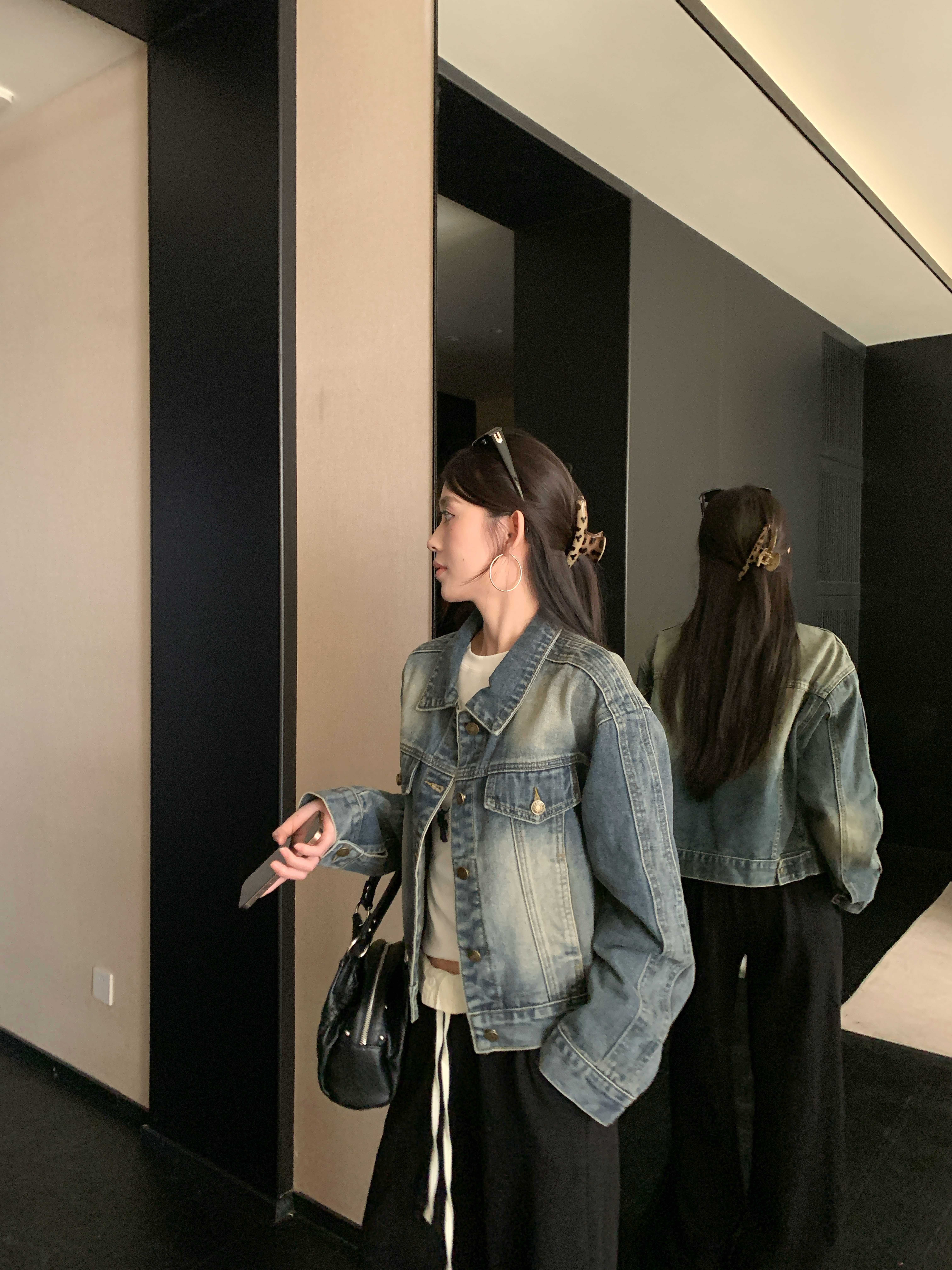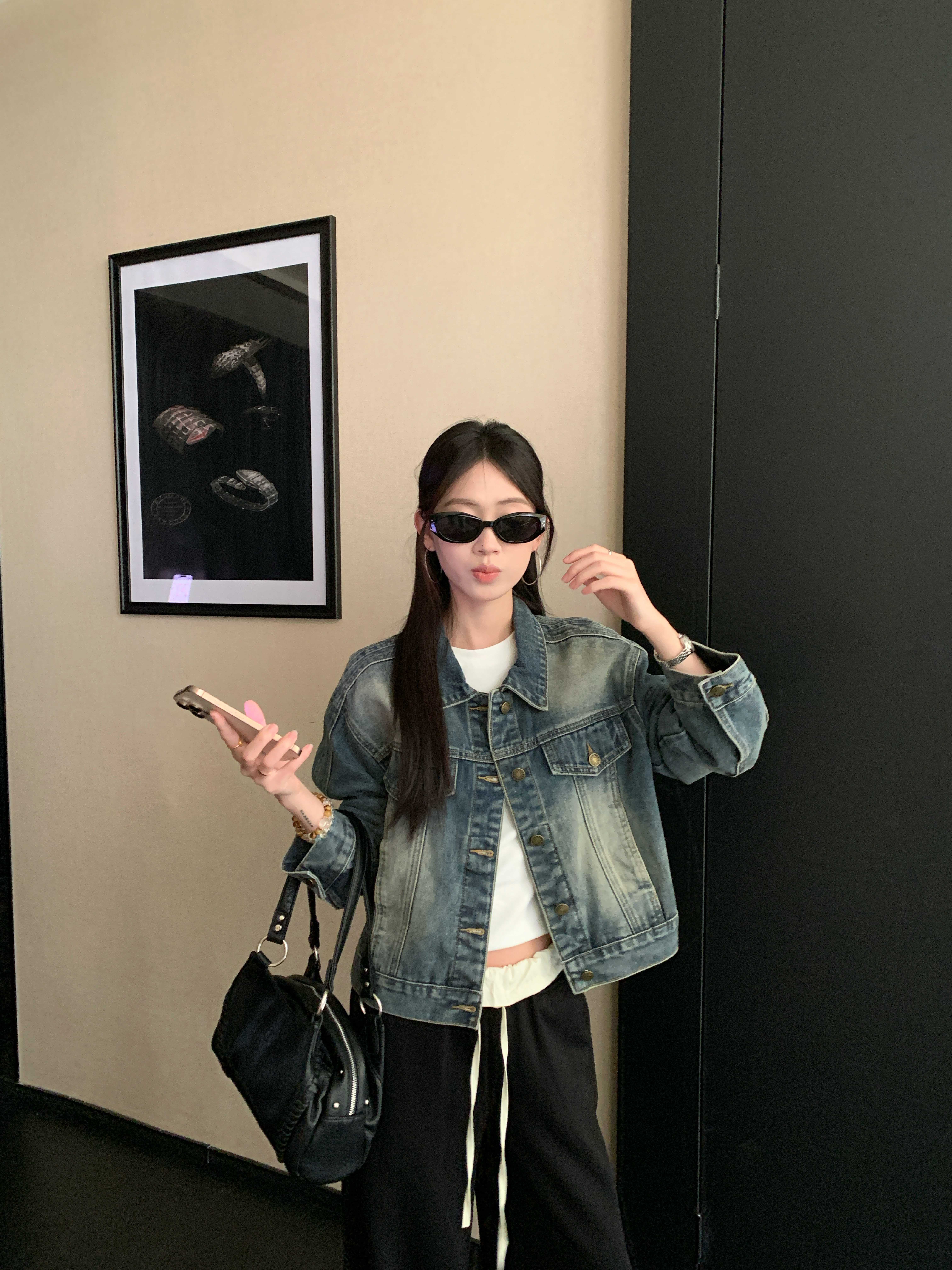 아메리칸 레트로 해체 질감 데님 재킷 루즈핏 프로필 모양 몸매 가꾸기 슬림해 보이는 워크웨어 재킷 여성