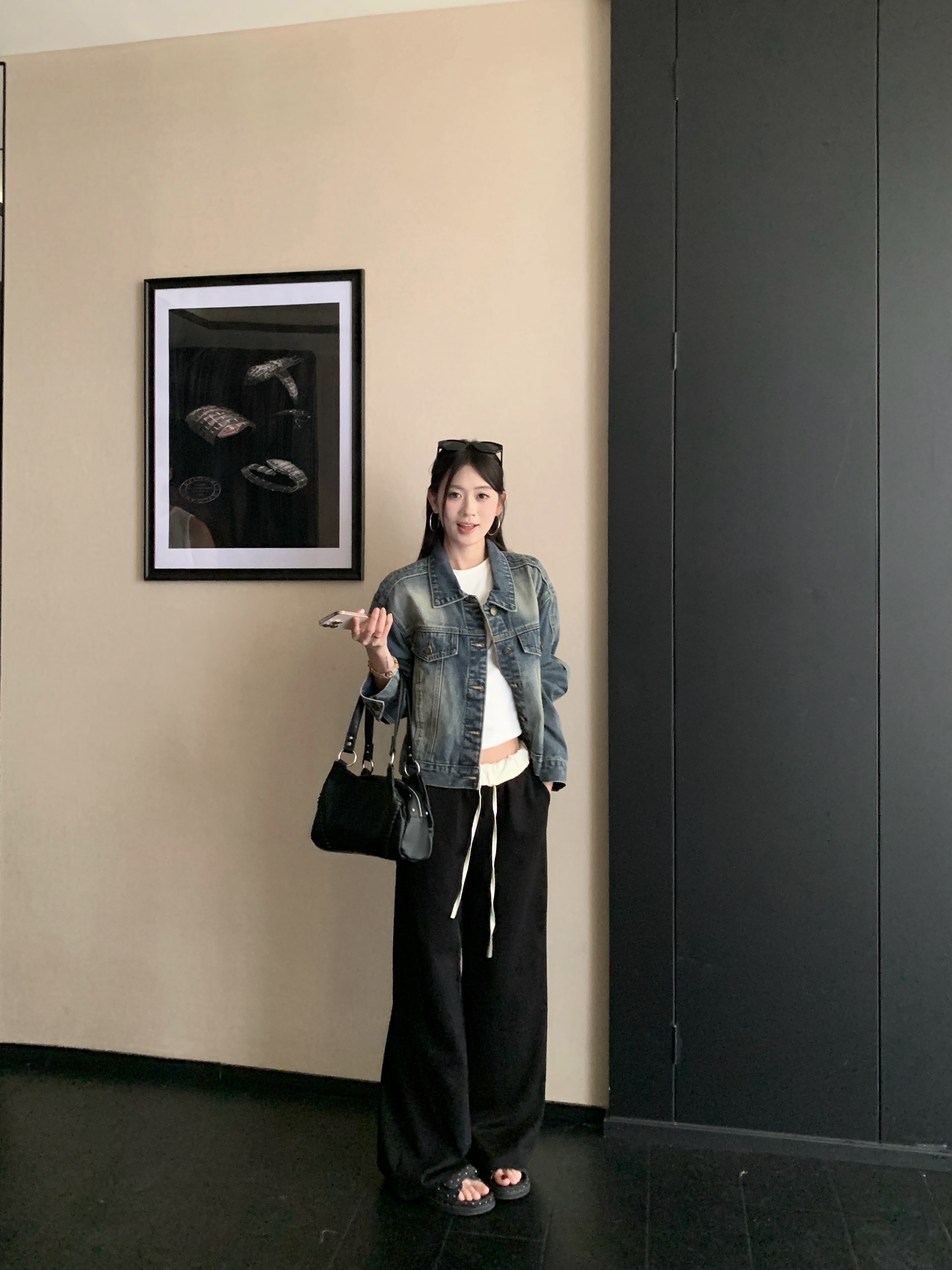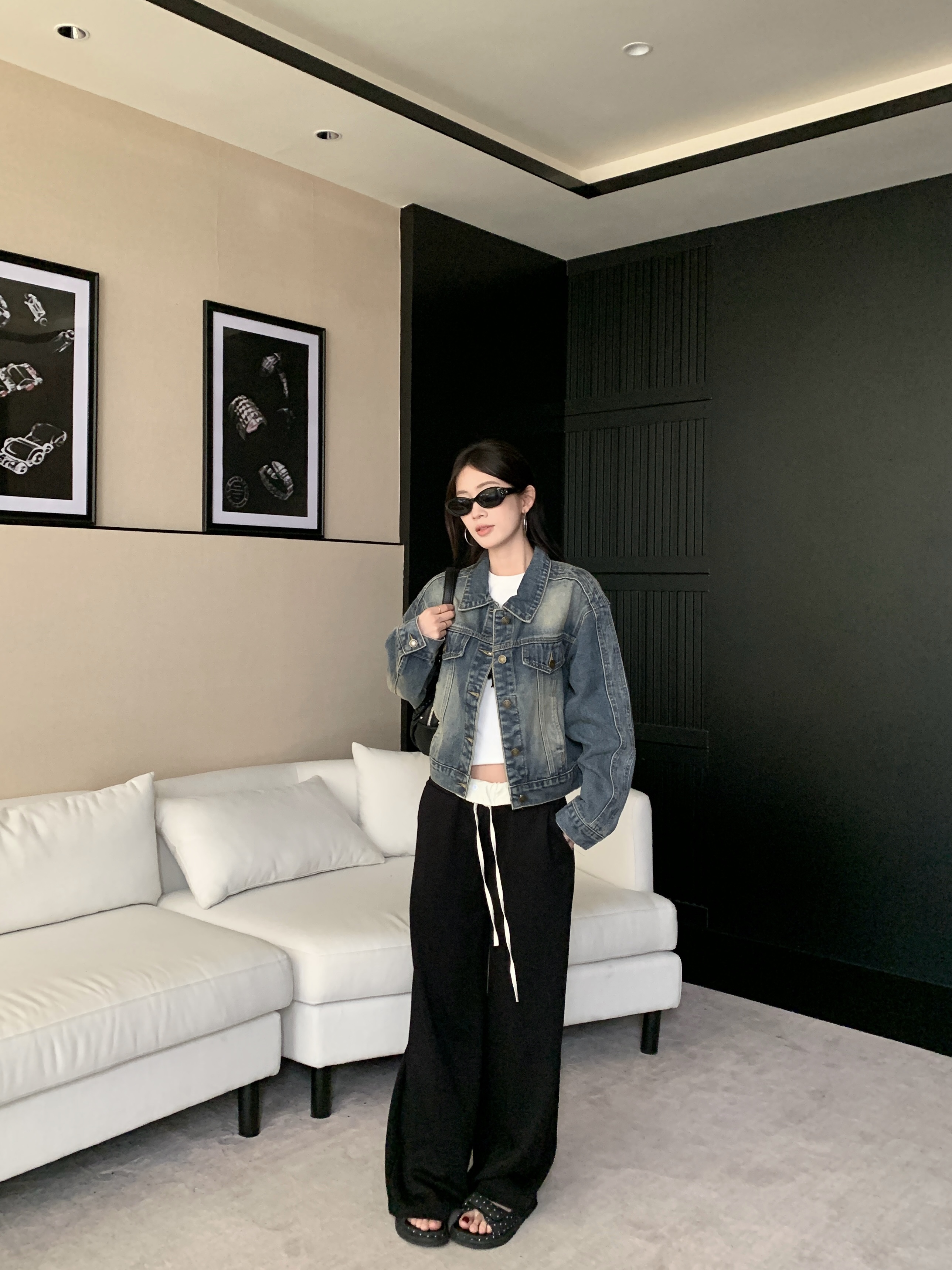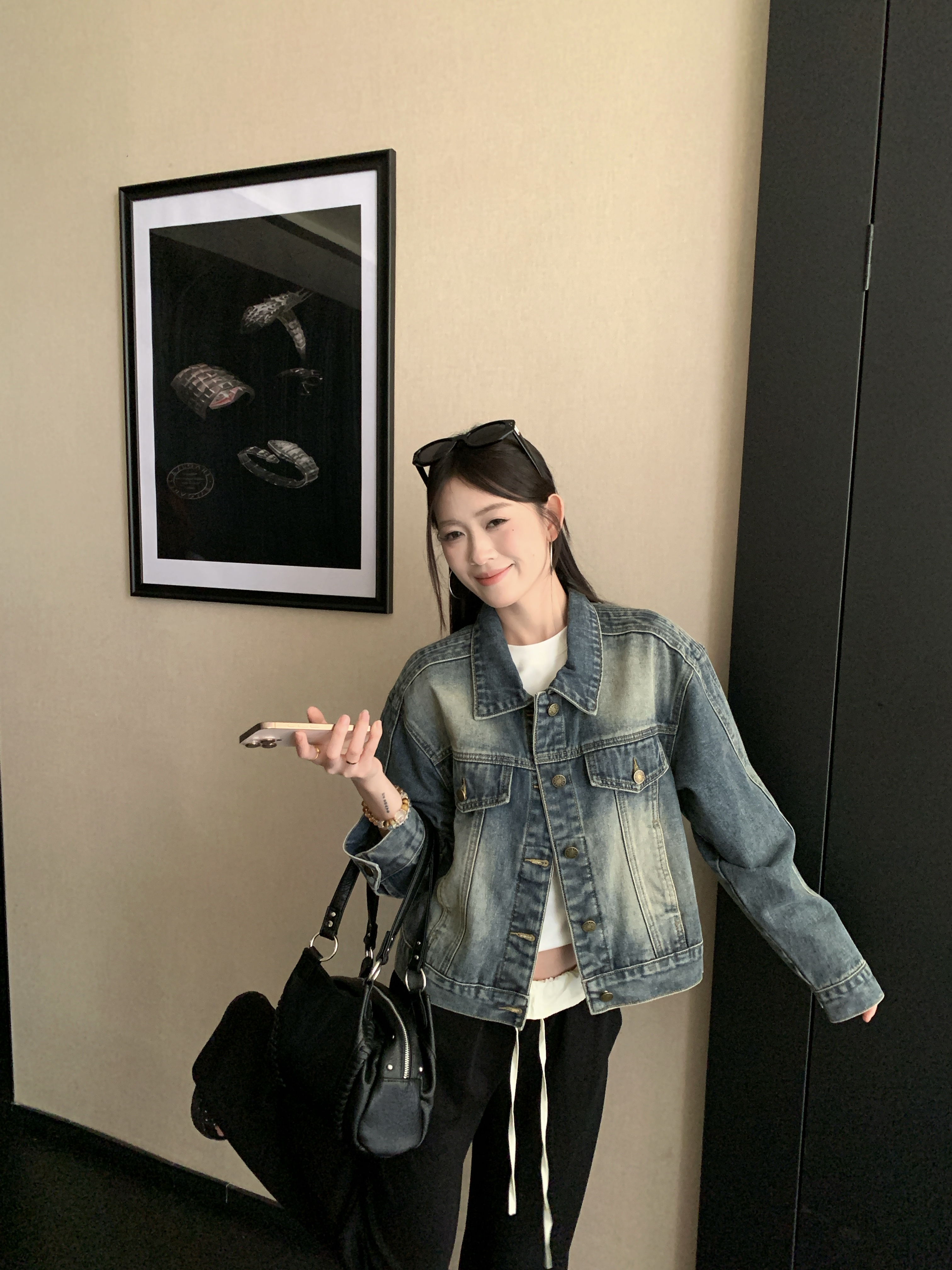 실사 검정색 데님 작은 대중 디자인 섹션 쇼트 스타일 루즈핏 데님 재킷