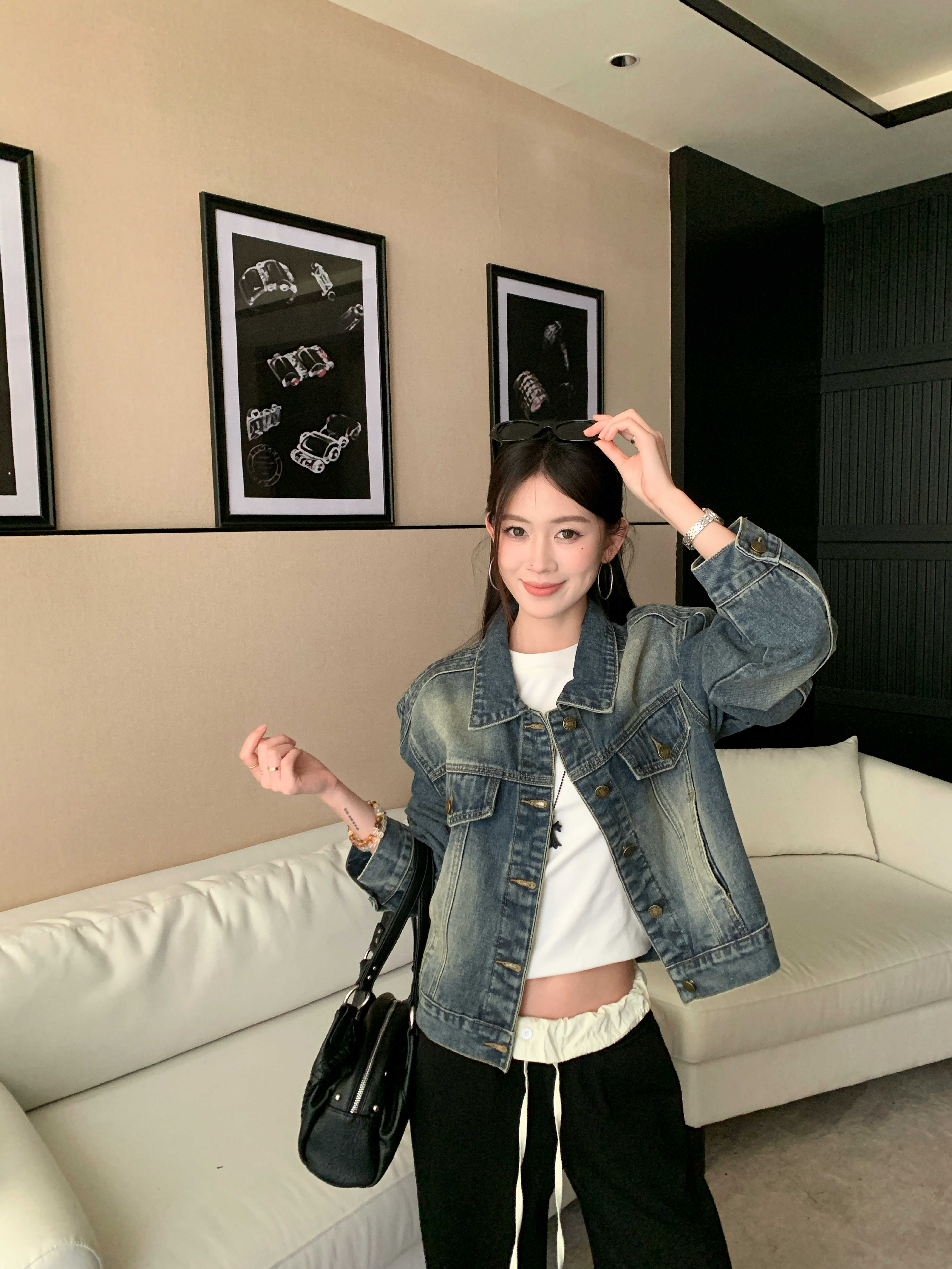 실사 핫걸 苾 입력 튀김 소금 워싱 블루 쇼트 스타일 데님 재킷