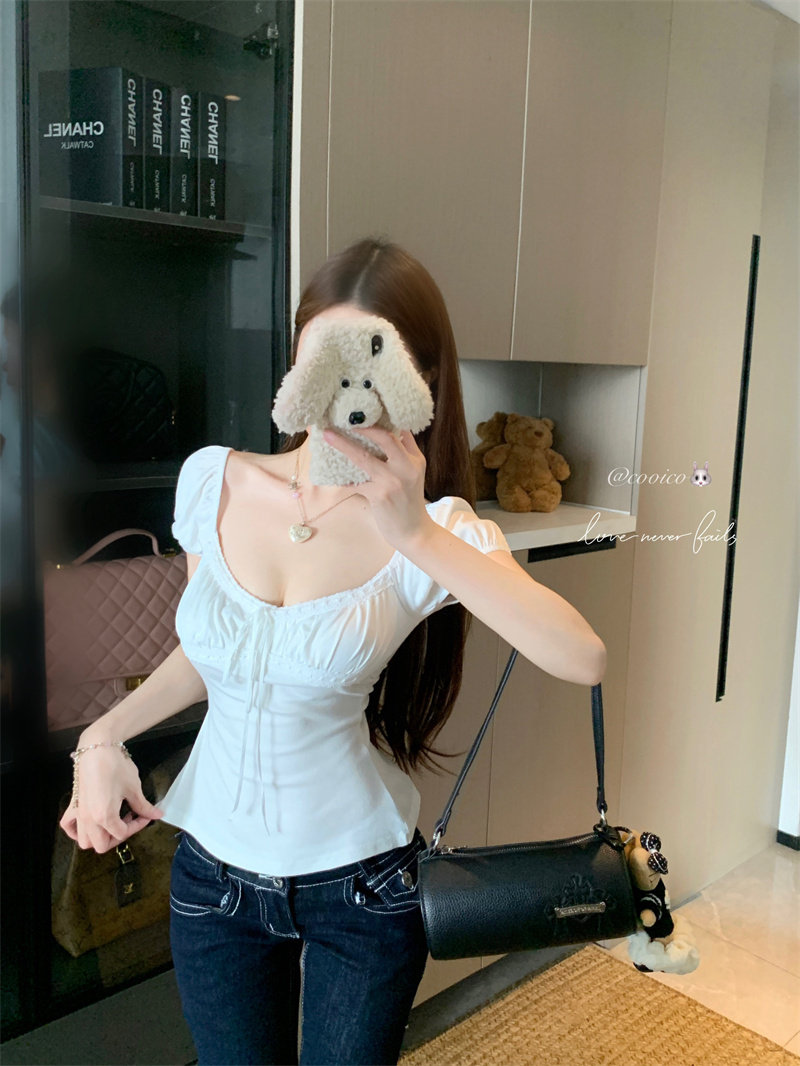260 그램 사람들 면 회색 긍정적 인 어깨 u 칼라 반팔 티셔츠 여성 여름 레이스 레이스 핫걸 작은 셔츠 몸매 가꾸기 허리 수축 맨위