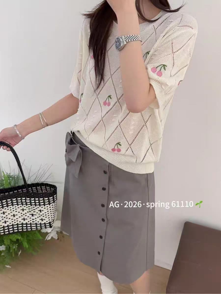 한 부서 주간 실크 아마 여름 새로운 반팔 작은 꽃 자수 귀여운 연령 감소 홀로우 아웃 니트 스웨터 티셔츠 무거운 작업 여성