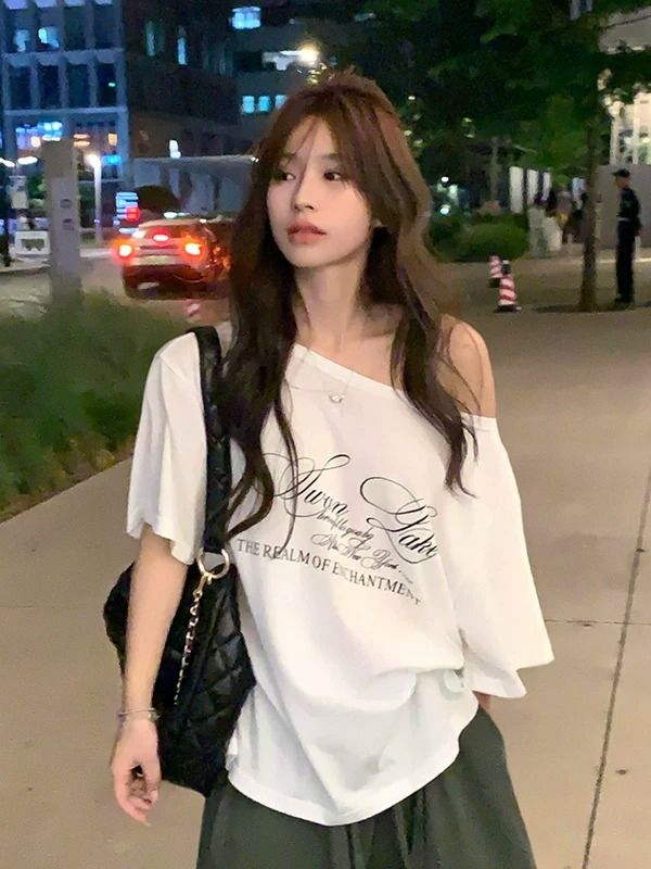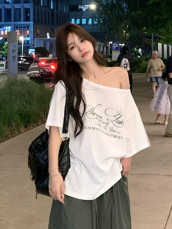 경관 그림 40 순면 220 그램 92 면 8 암모니아 Lun 비스듬한 칼라 오프숄더 오프숄더 반팔 티셔츠 여성