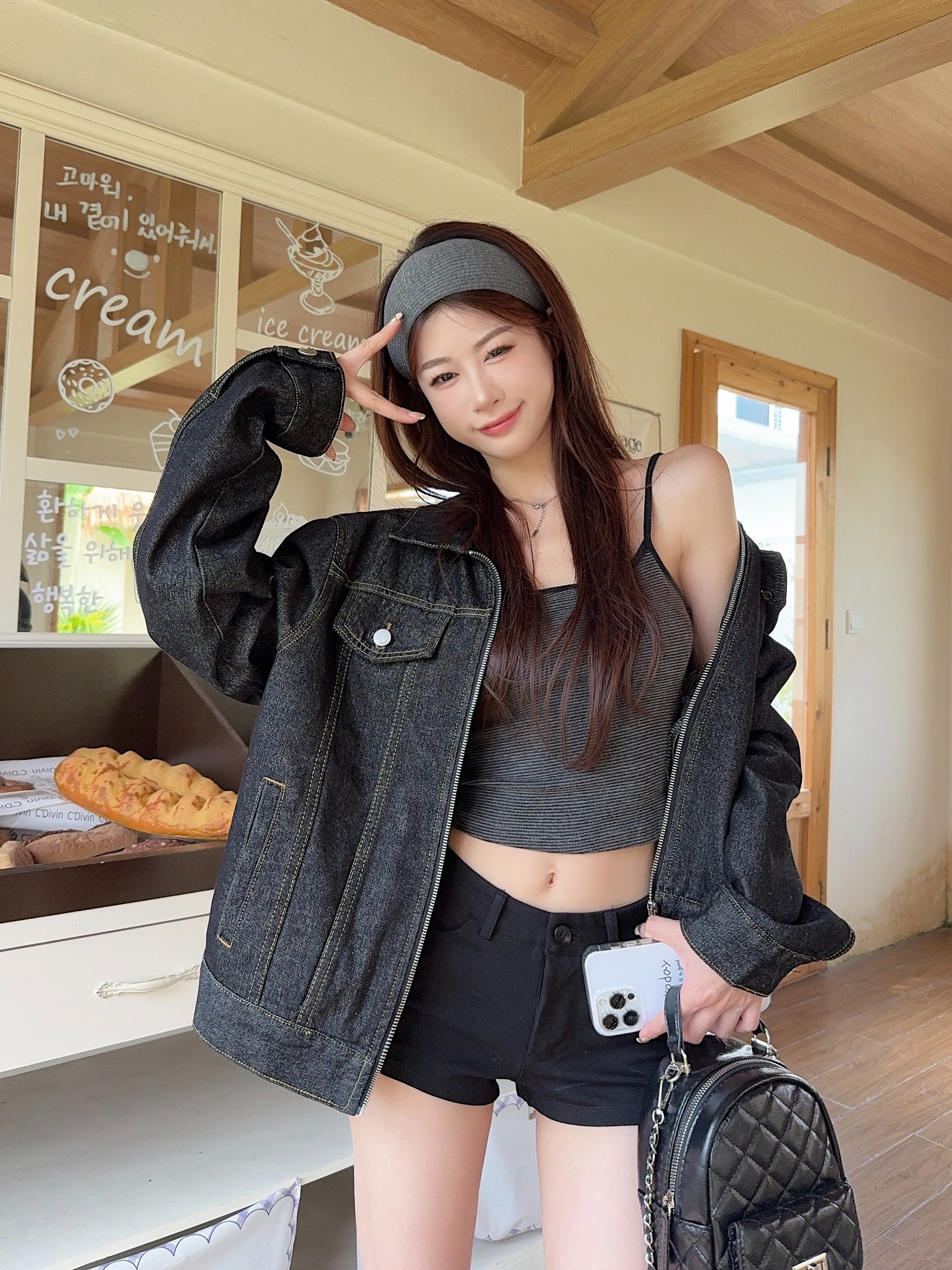 실사 핫걸 苾 입력 튀김 소금 워싱 블루 쇼트 스타일 데님 재킷