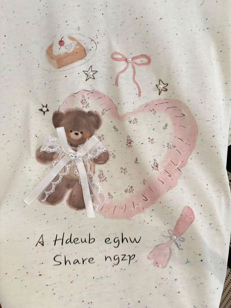 광저우 원단 이후 패키지 프린트 패치워크 레이스 루즈핏 반팔 티셔츠 여성