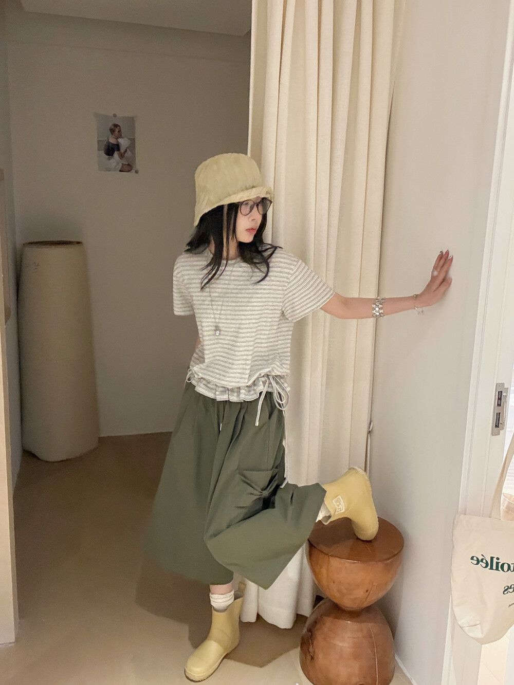재고 있음 한국 스타일 빛 요리 한 바람 황색 스트라이프 POLO 셔츠 반팔 여성 여름 새로운 품격 다용도 연령 감소 맨위