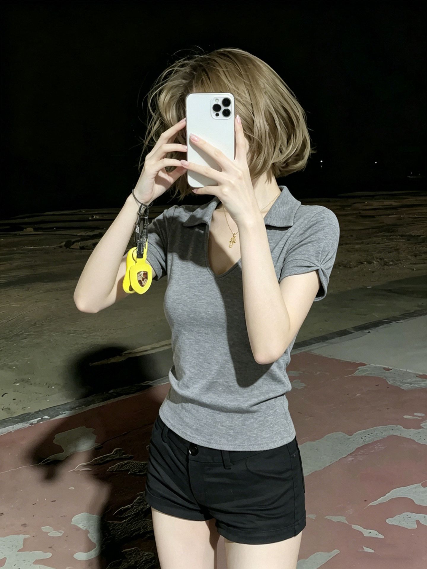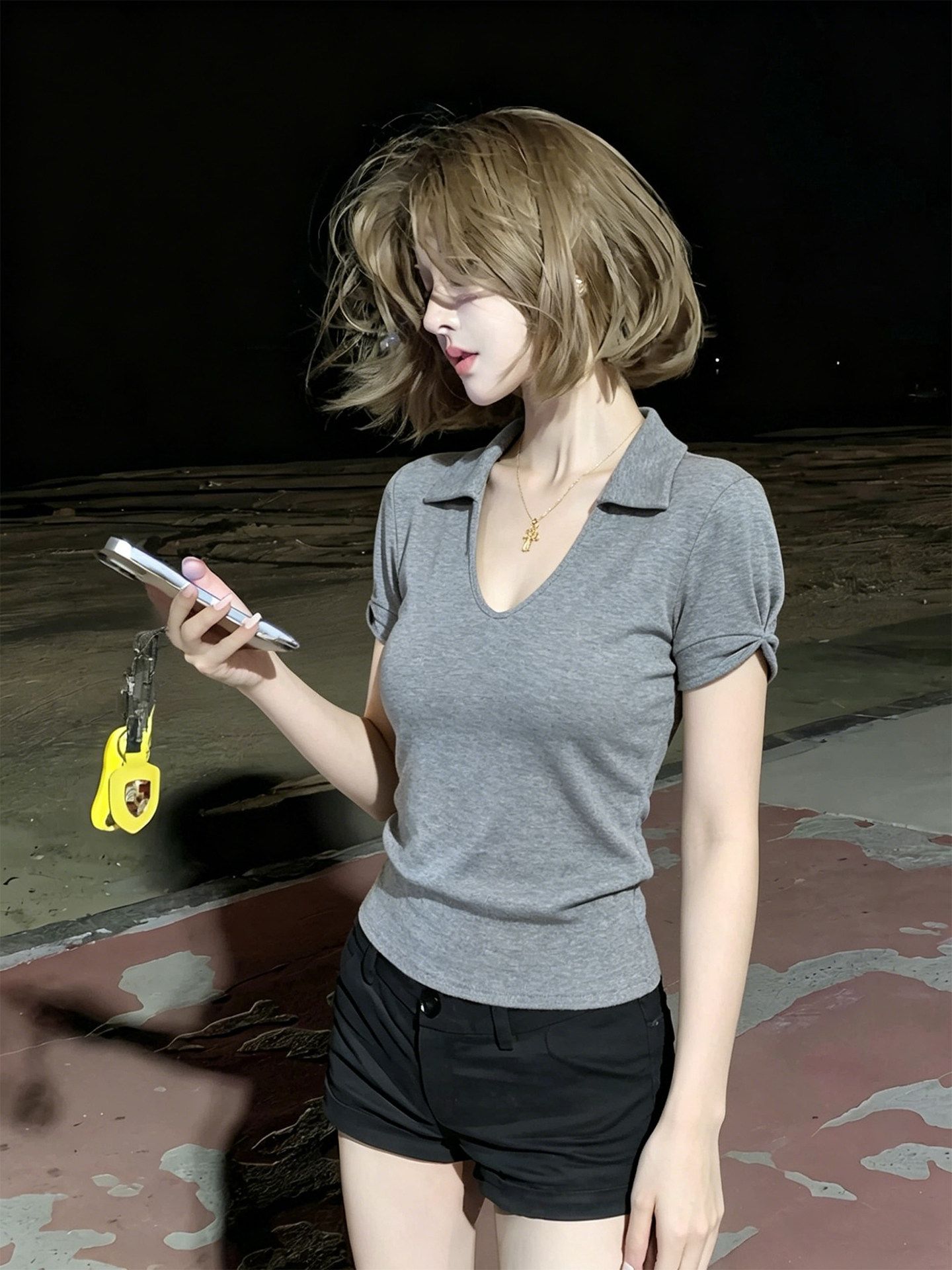 260 그램 사람들 면 프랑스식 핫걸 품격 V넥 POLO 셔츠 여성 여름 허리 수축 슬림해 보이는 반팔 긍정적 인 어깨 쇼트 스타일 티셔츠
