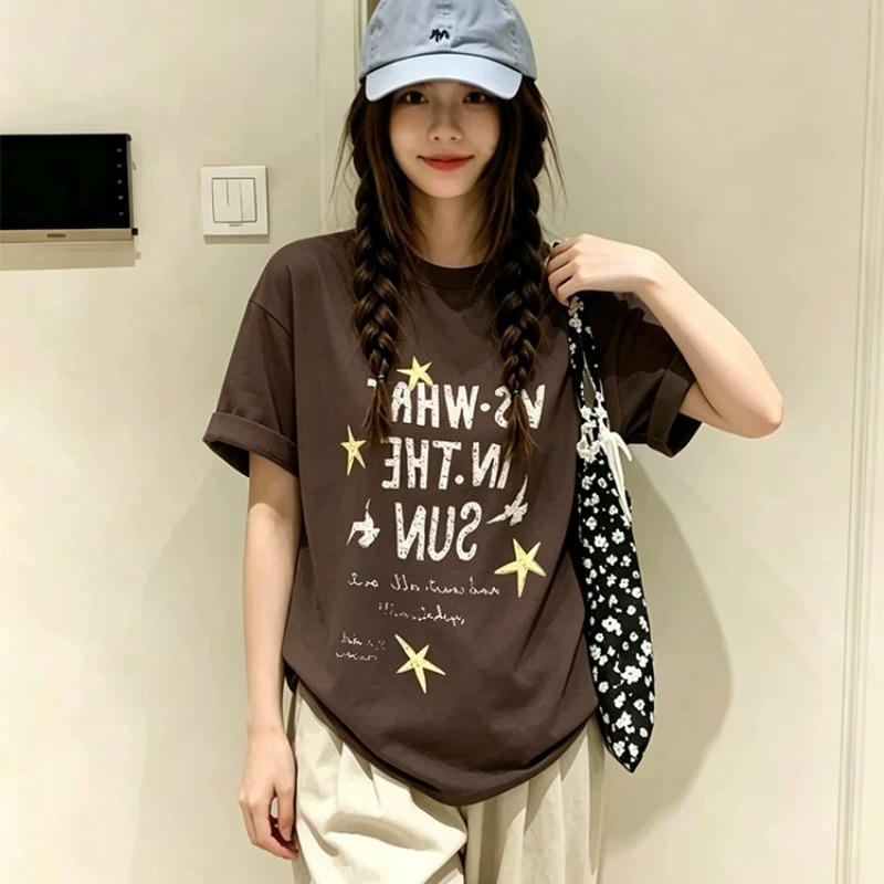 경관 그림 21 순면 210 그램 여름 드레스 한 부서 반팔 티셔츠 여성 한국 스타일 루즈핏 빅 사이즈 프린트